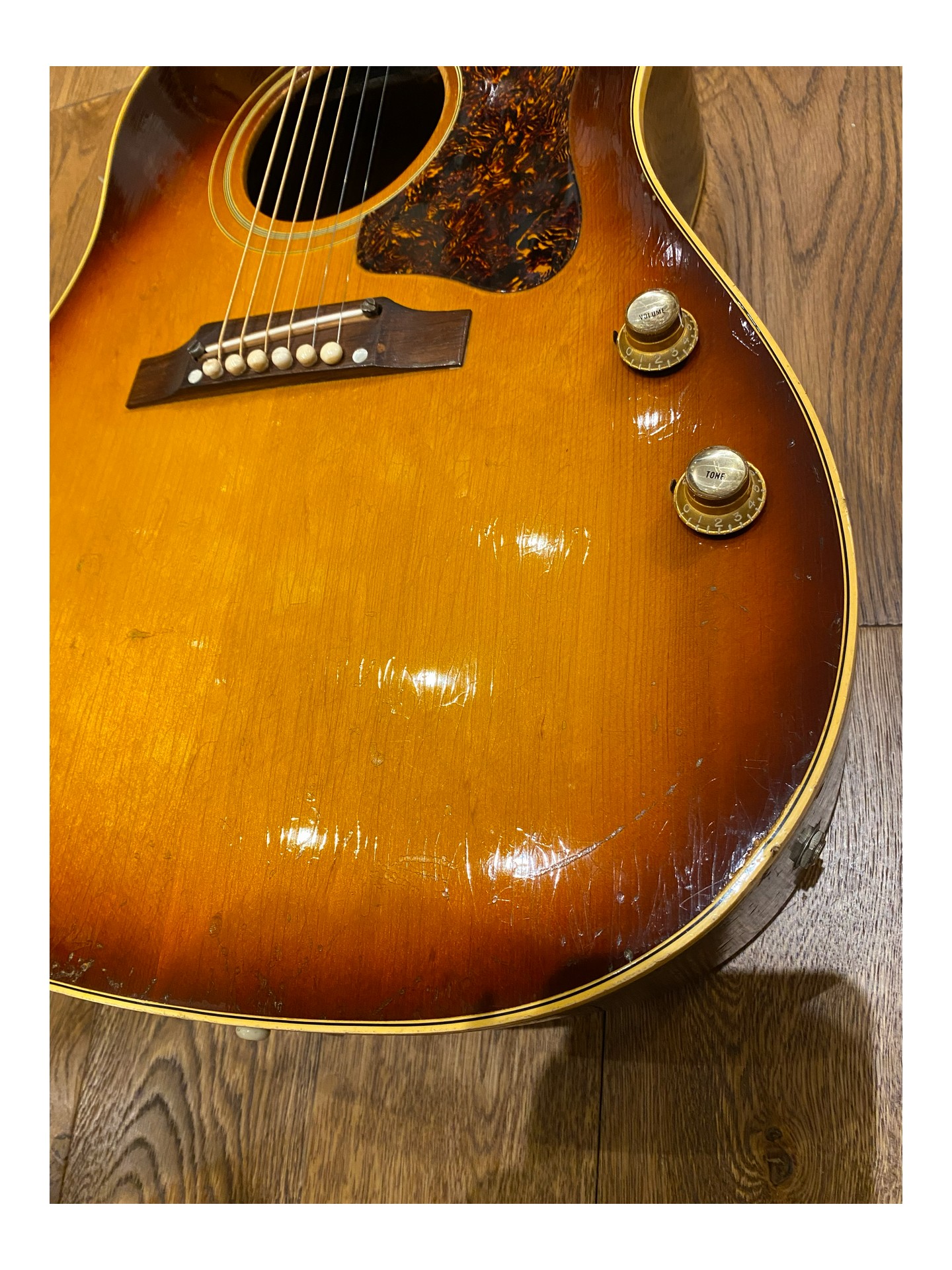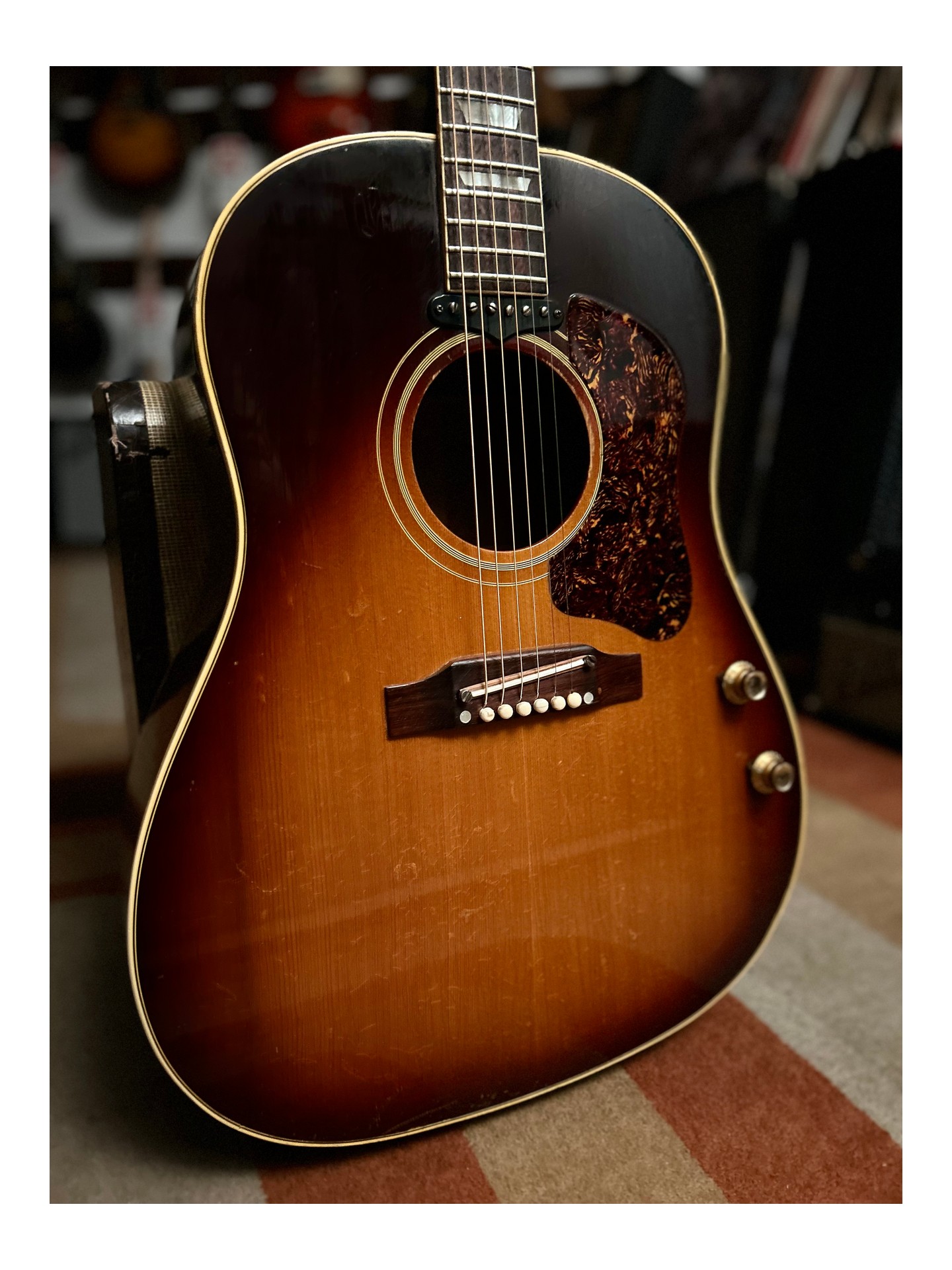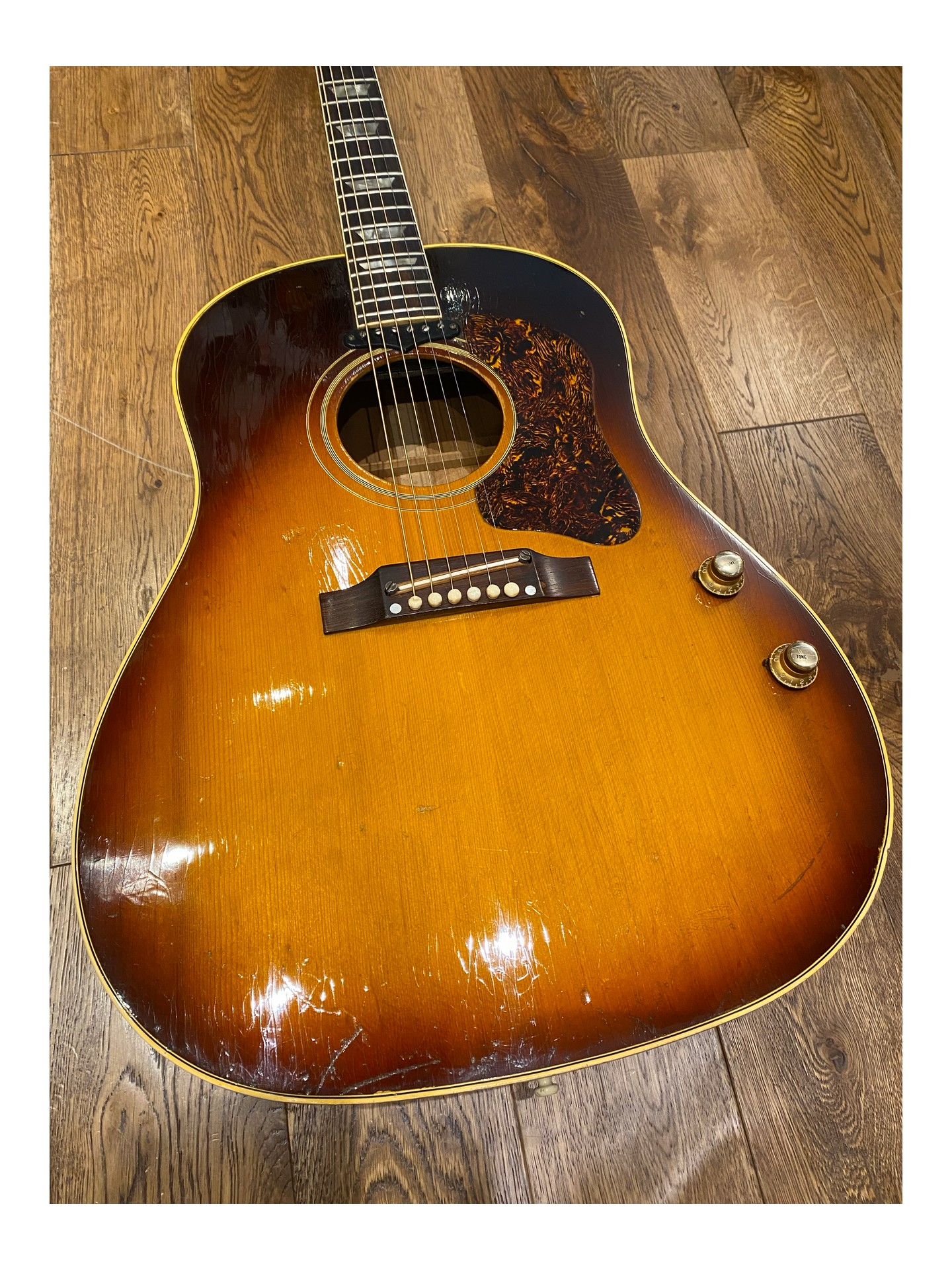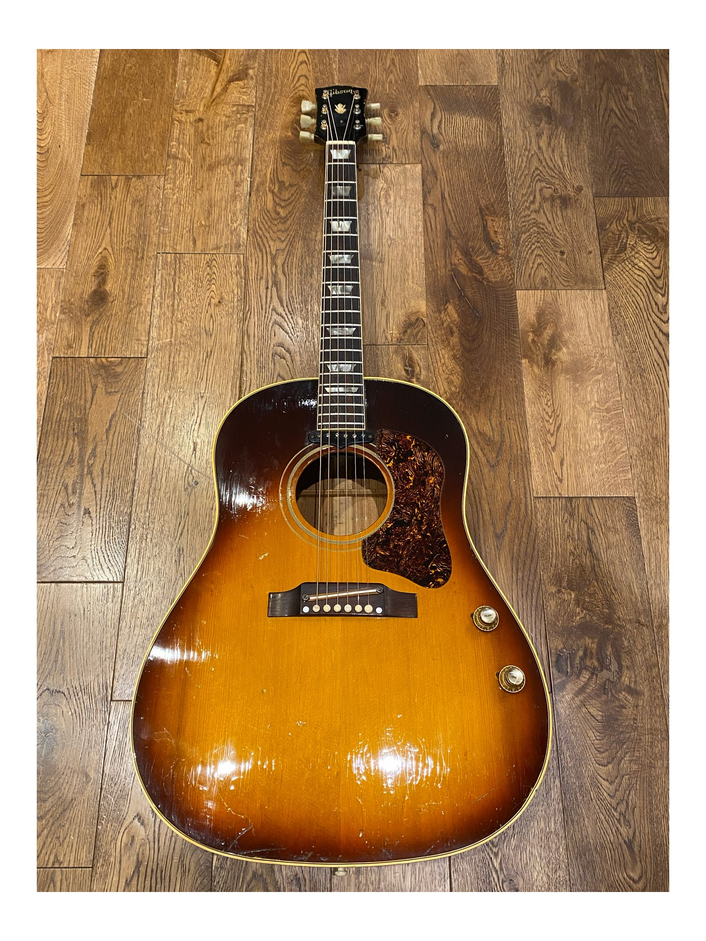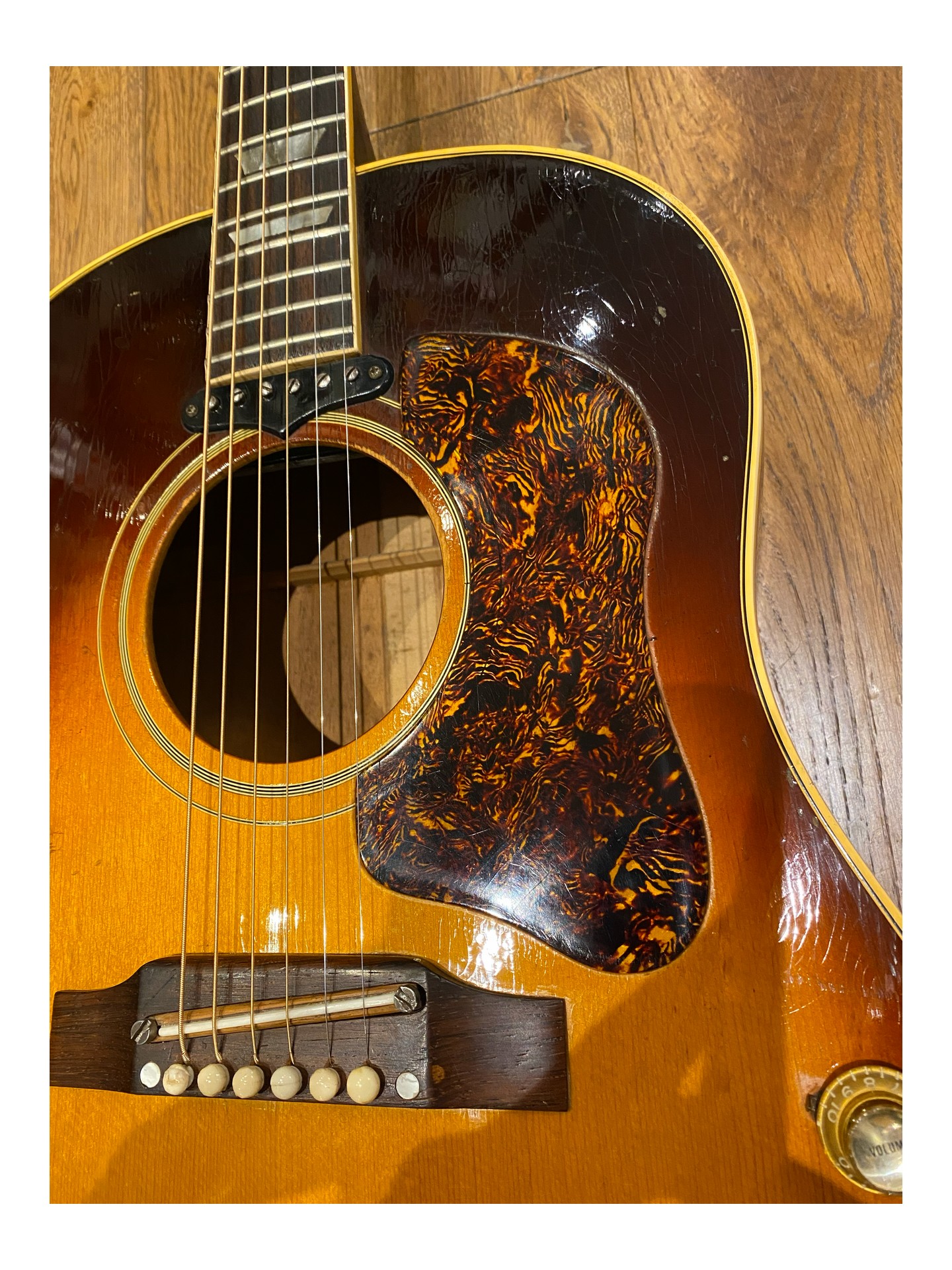 A 1967 Gibson J-160E in excellent condition, with a beautiful patina covering the entire instrument, reflecting its 58 years of age. This guitar has no cracks and is completely original. The J-160E is a round-shouldered dreadnought built with a laminated spruce top, mahogany back, sides, and neck, and rosewood fingerboard and bridge, with the intention of being played electrified. These guitars were designed for the stage, with an adjustable P-90 pickup and easy-to-see and easy-to-reach volume and tone controls. They also feature ladder bracing to prevent feedback on stage. John Lennon used a 1964 model on “I Want to Hold Your Hand,” “Nowhere Man,” and “Girl.” You know how they sound…