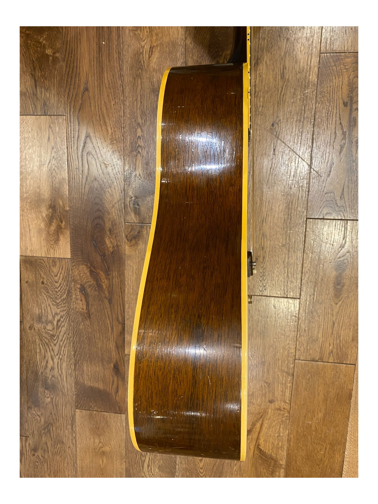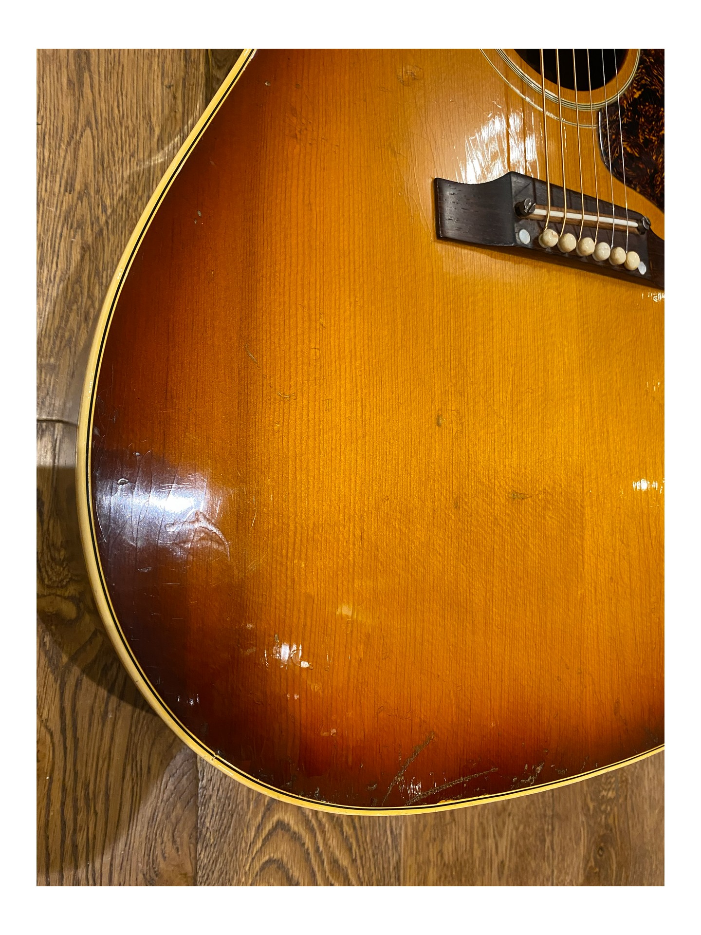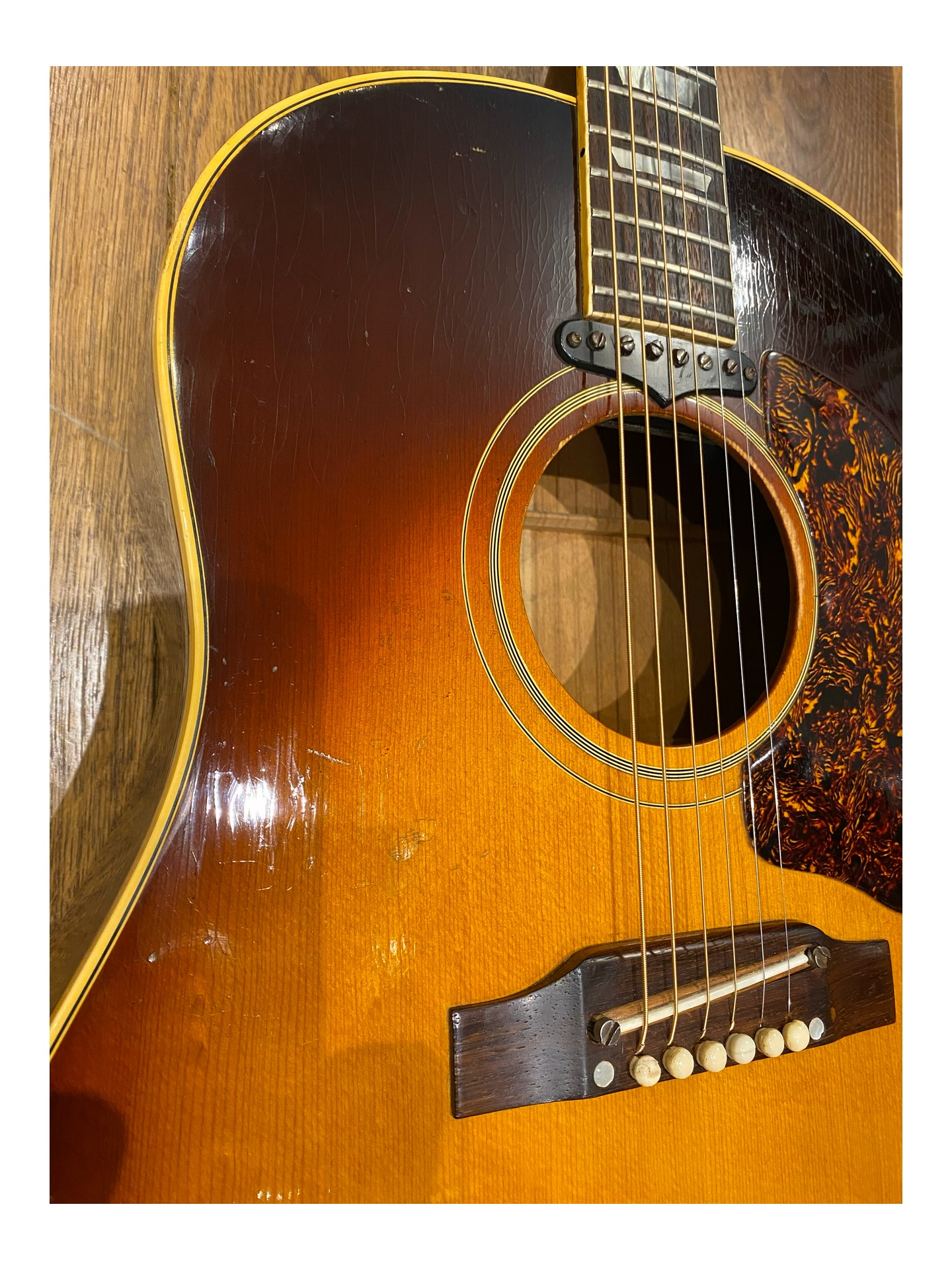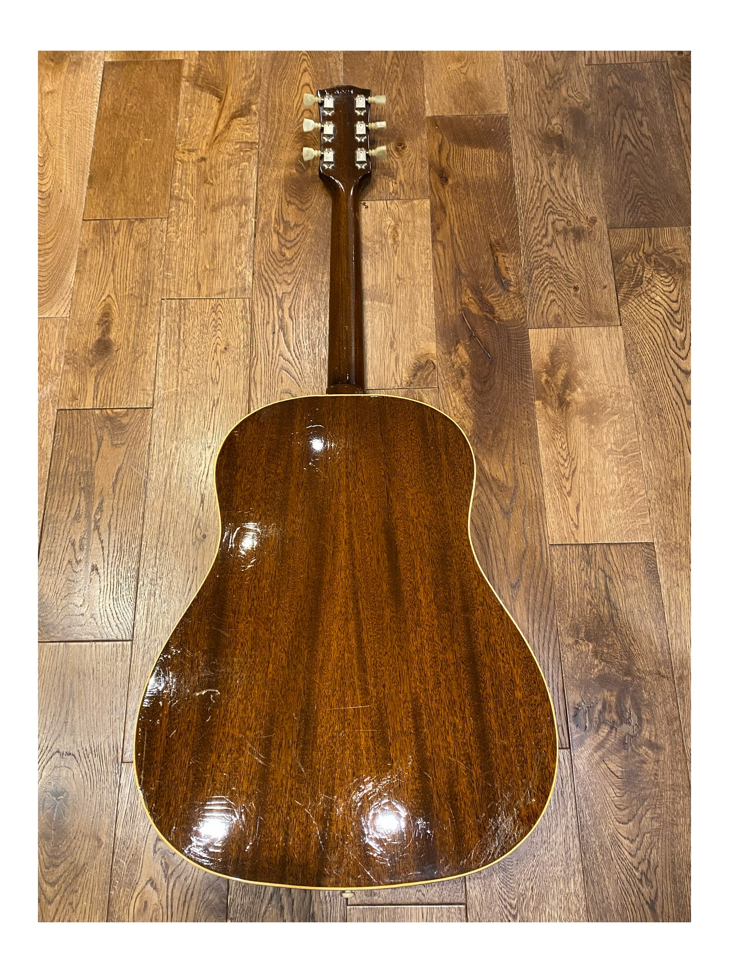 A 1967 Gibson J-160E in excellent condition, with a beautiful patina covering the entire instrument, reflecting its 58 years of age. This guitar has no cracks and is completely original. The J-160E is a round-shouldered dreadnought built with a laminated spruce top, mahogany back, sides, and neck, and rosewood fingerboard and bridge, with the intention of being played electrified. These guitars were designed for the stage, with an adjustable P-90 pickup and easy-to-see and easy-to-reach volume and tone controls. They also feature ladder bracing to prevent feedback on stage. John Lennon used a 1964 model on “I Want to Hold Your Hand,” “Nowhere Man,” and “Girl.” You know how they sound…