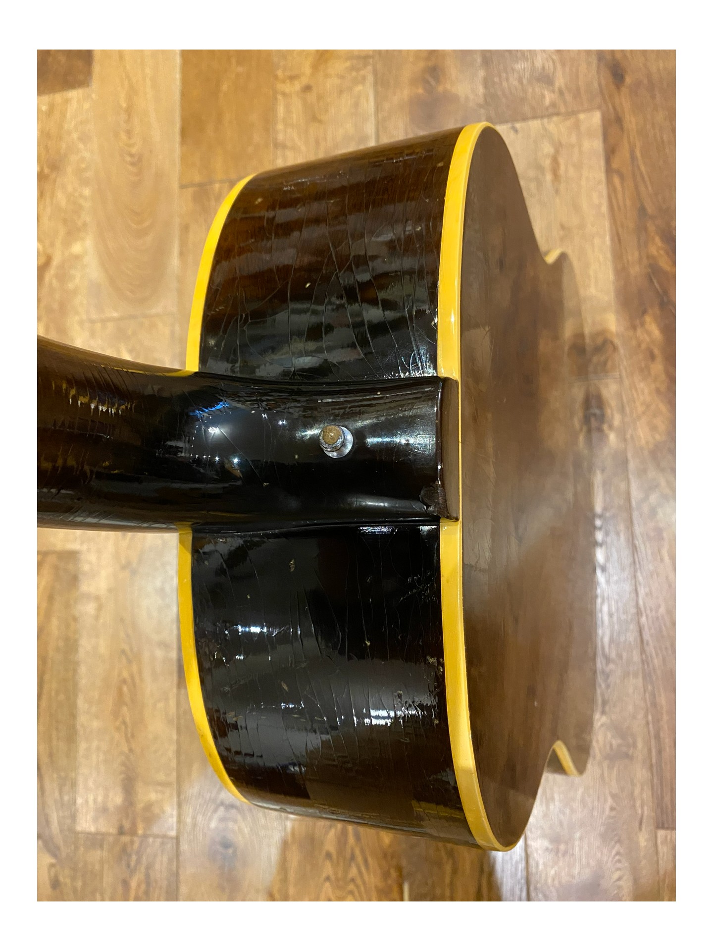 Une Gibson J-160E de 1967 en excellent état, avec une magnifique patine sur l’ensemble de l’instrument témoignant de ses 58 ans. Cette guitare ne présente aucune fissure et est entièrement d’origine. La J-160E est une dreadnought à épaules rondes a été construite avec une table laminée en épicéa, un dos, des éclisses et un manche en acajou, une touche et un chevalet en palissandre dans l’optique d’être jouée électrifiée. Ces guitares ont été conçues pour la scène, avec un micro P-90 réglable et un contrôle de volume et de tonalité, facile à voir et à atteindre. Elles sont également équipées d’un barrage en « échelle » pour éviter les larsens sur scène. John Lennon a utilisé un modèle de 1964 sur « I Want to Hold your Hand », « Nowhere Man » et « Girl ». Vous savez comment elles sonnent…