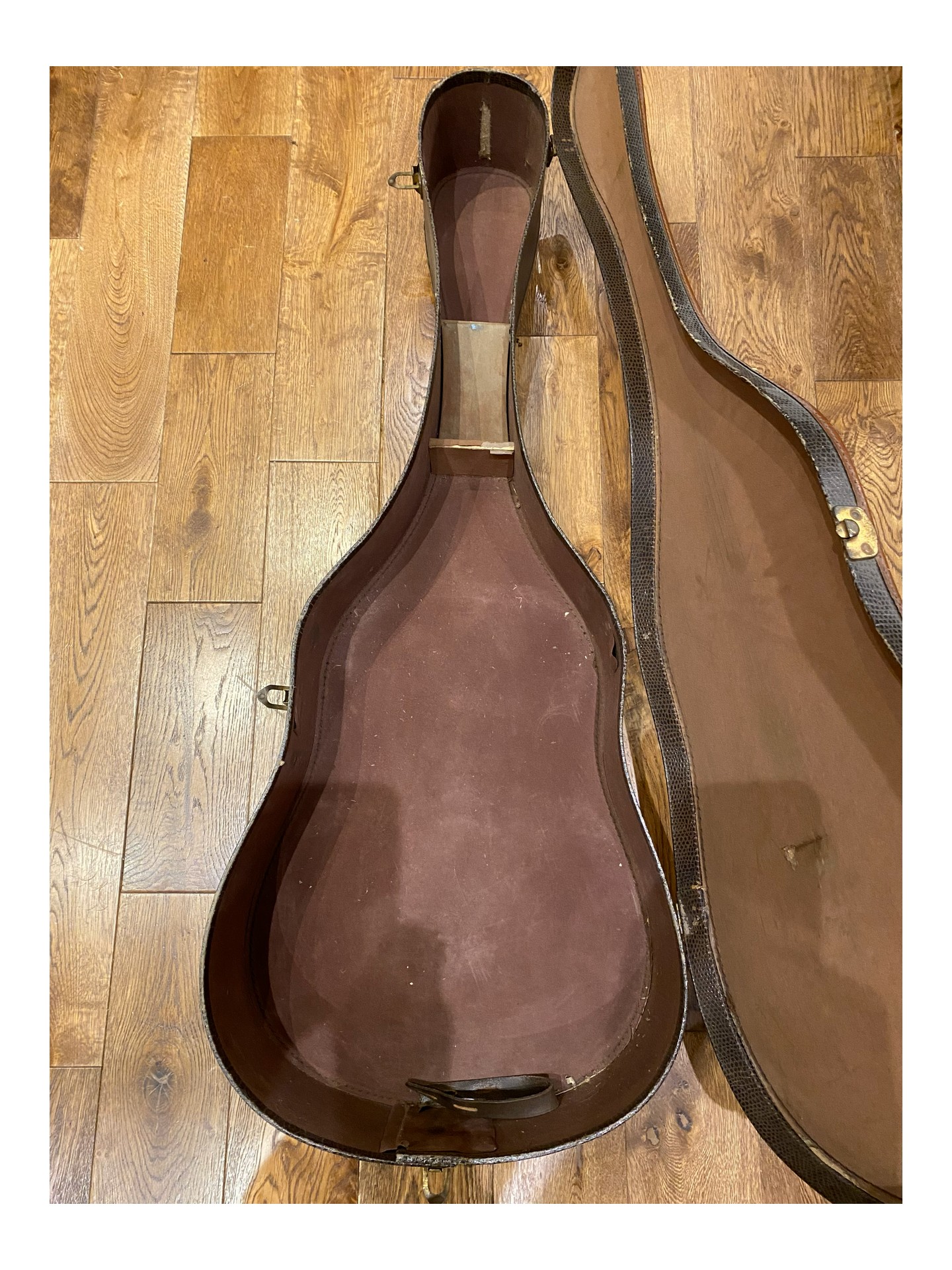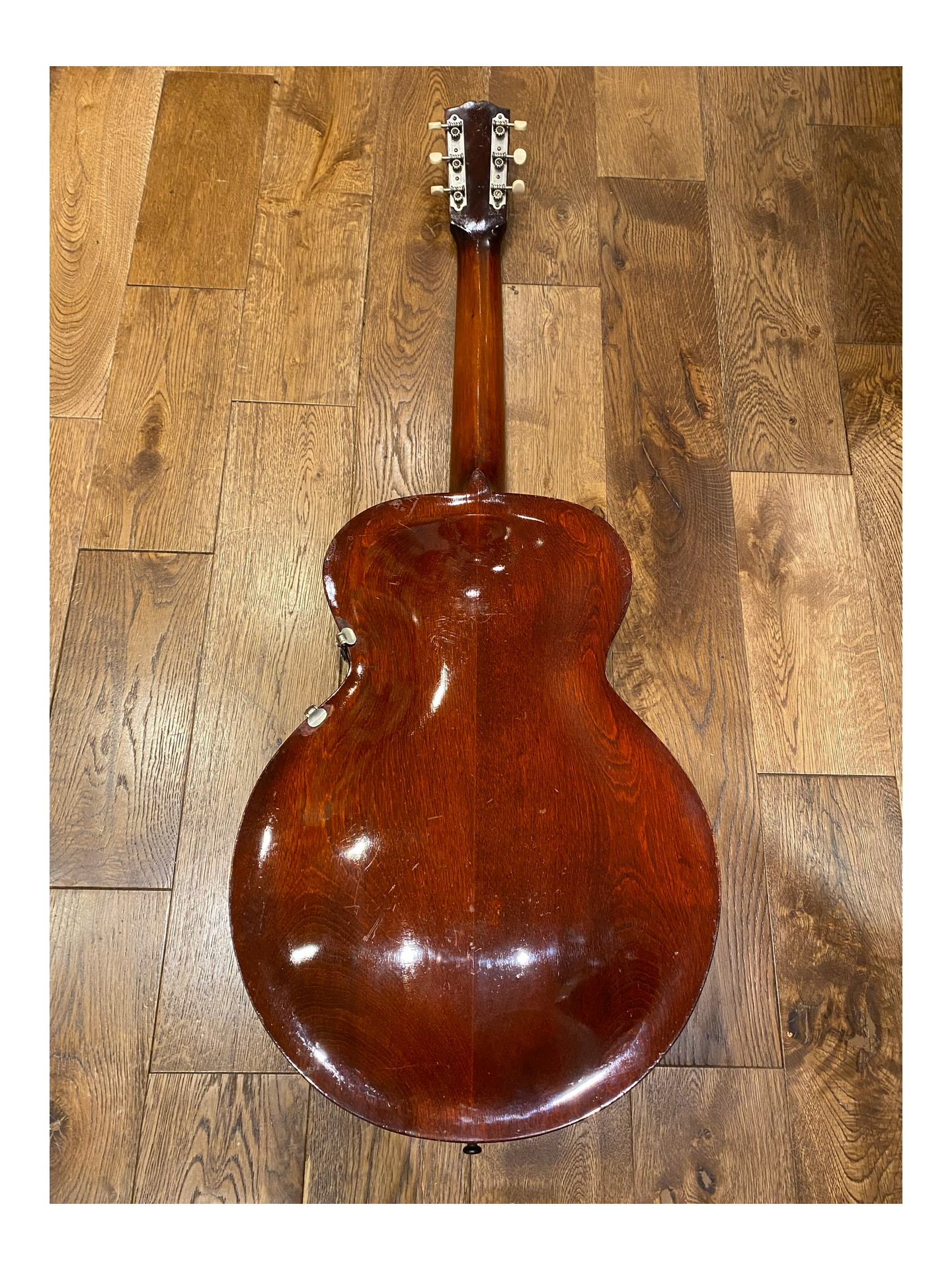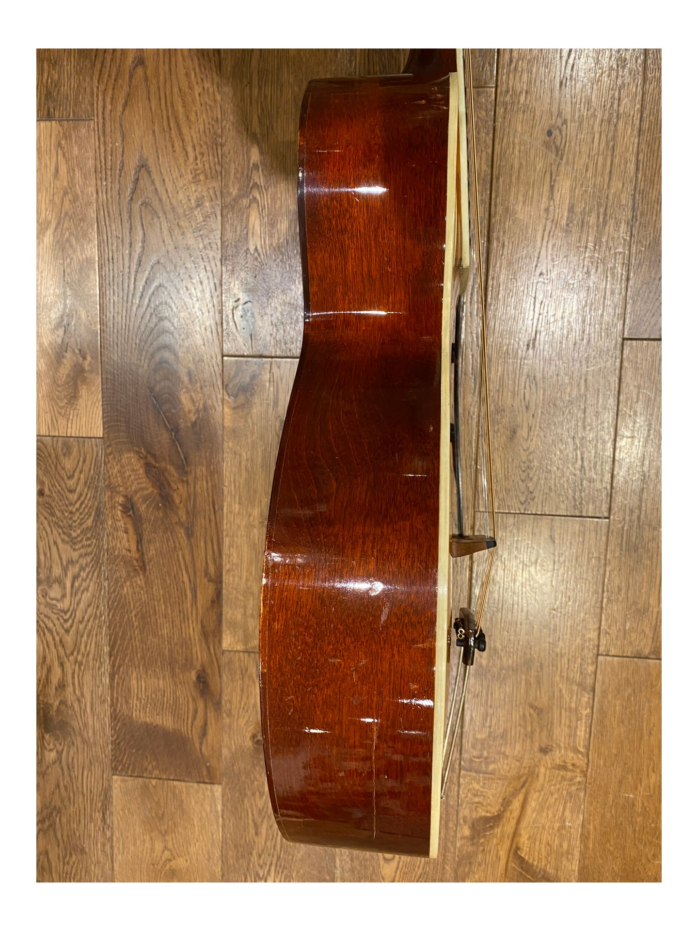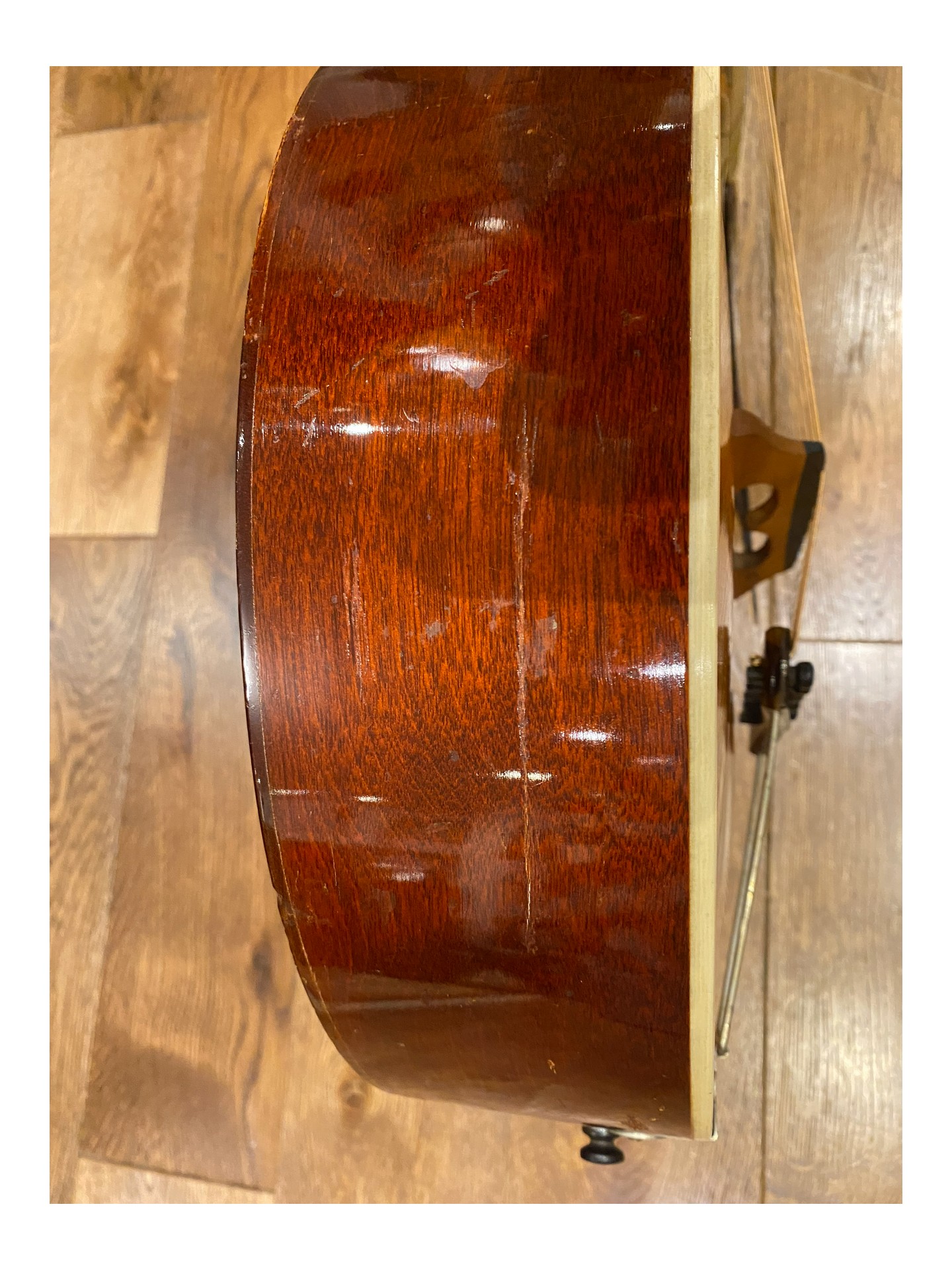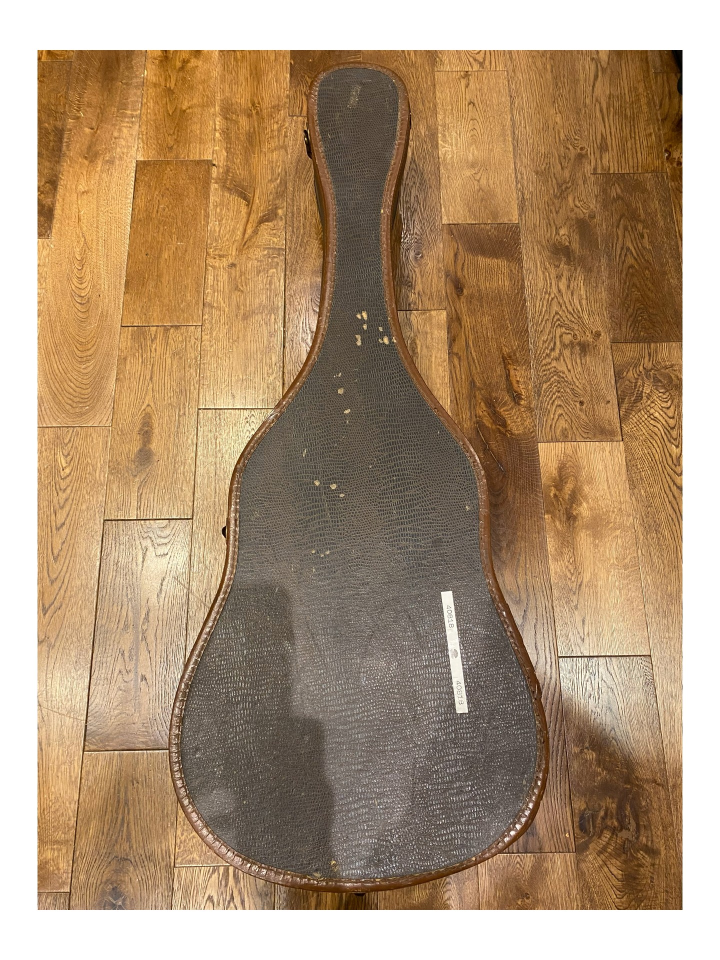 Cette Gibson L-1 de 1917 est dotée d’une table en épicéa archtop et d’un dos et d’éclisses en érable, ce qui lui confère le caractère compact et léger que l’on attend des premières guitares de la série L. Le manche en acajou de 24 pouces est équipé d’une touche en palissandre avec des incrustations de points en nacre, et ses mécaniques 3X3 non d’origine. La table à barrage en échelle lui confère une réponse précise et directe, avec des médiums secs. La finition blonde transparente montre les signes honnêtes du temps, avec un patine et des traces d’usure typiques.