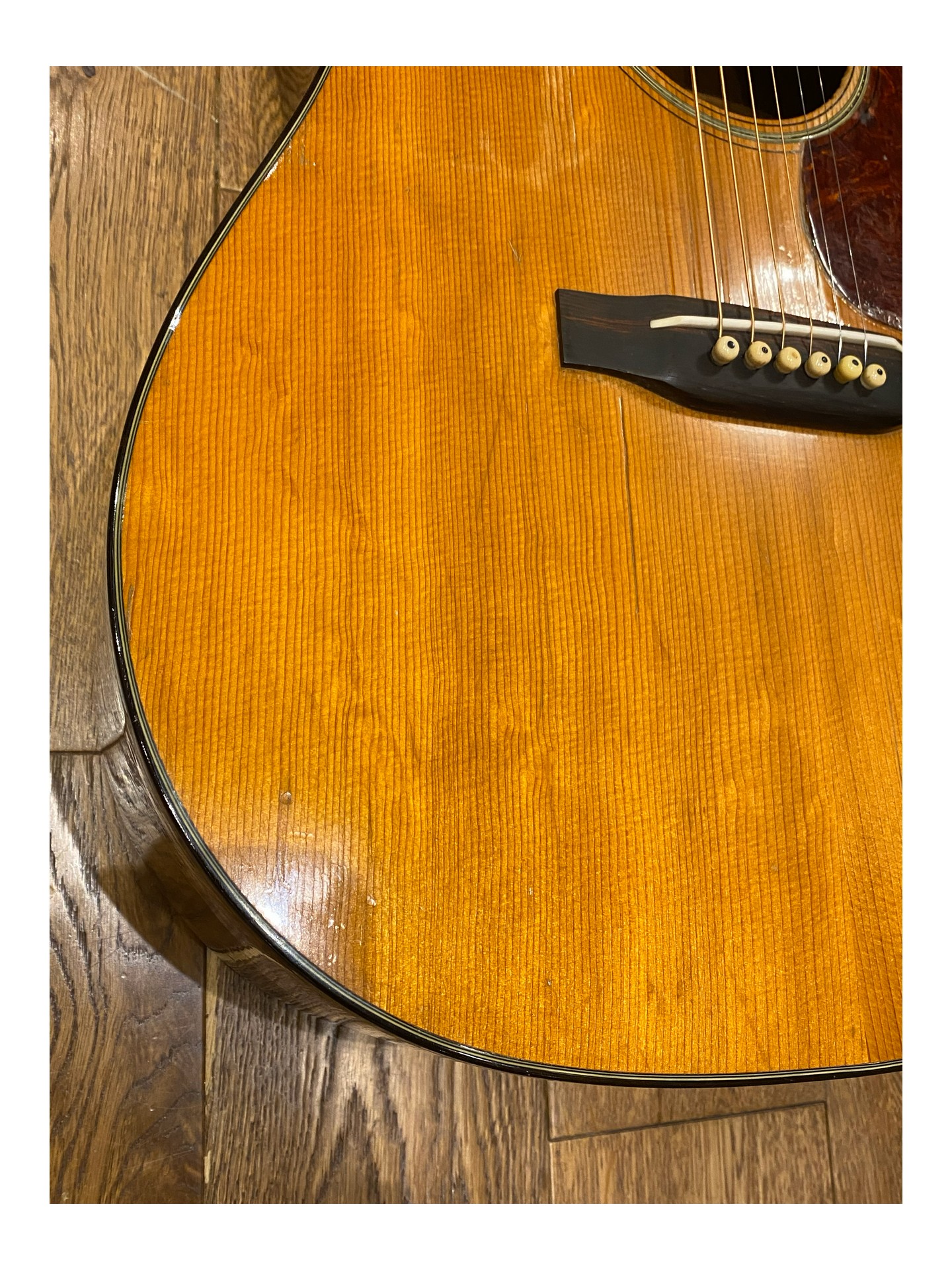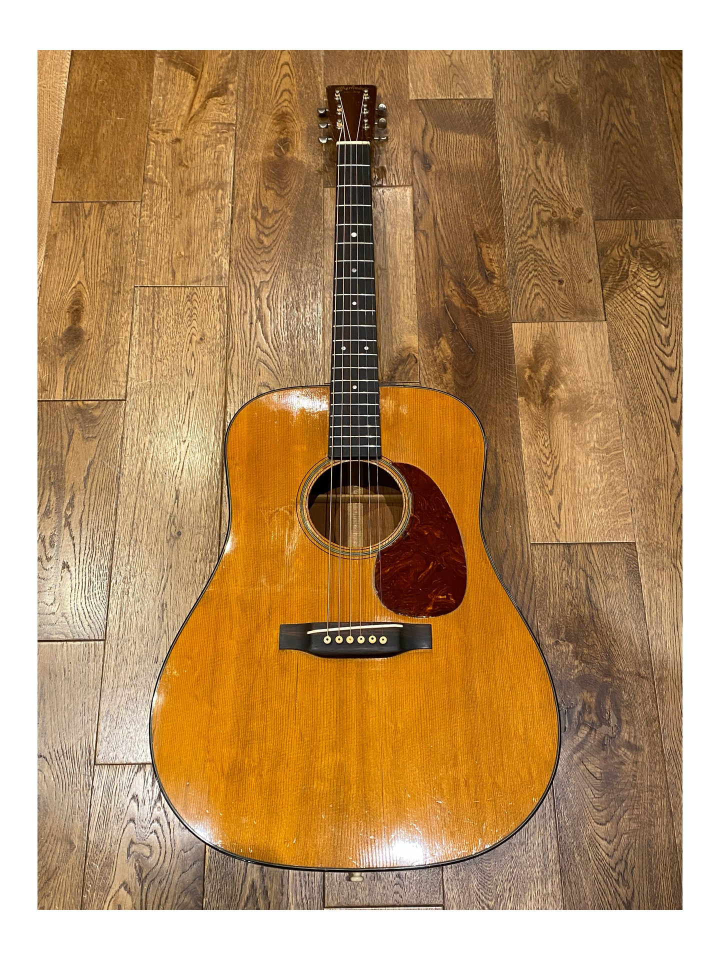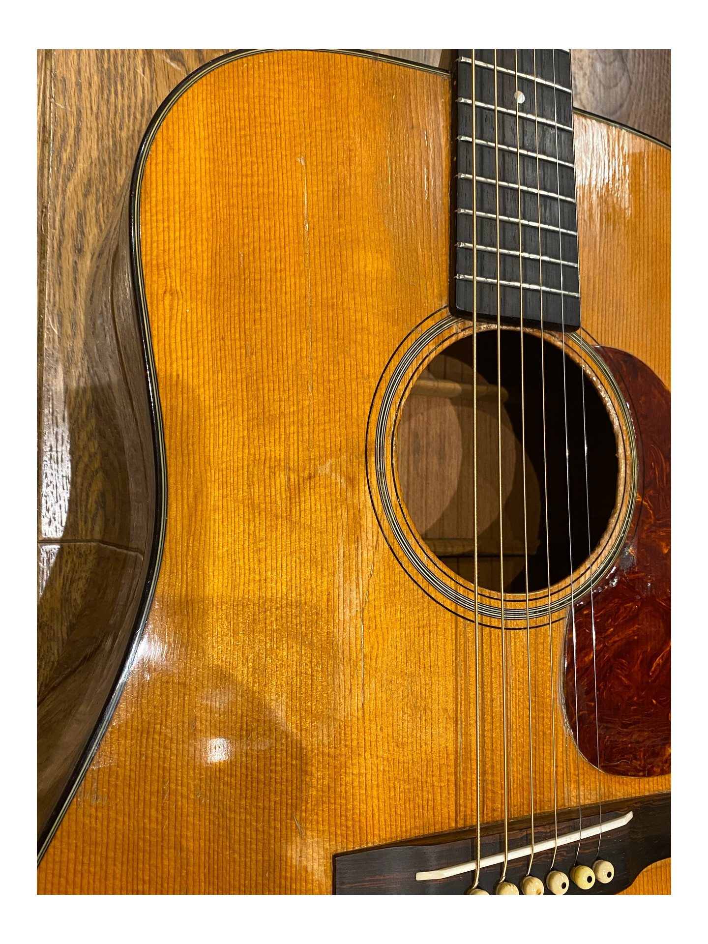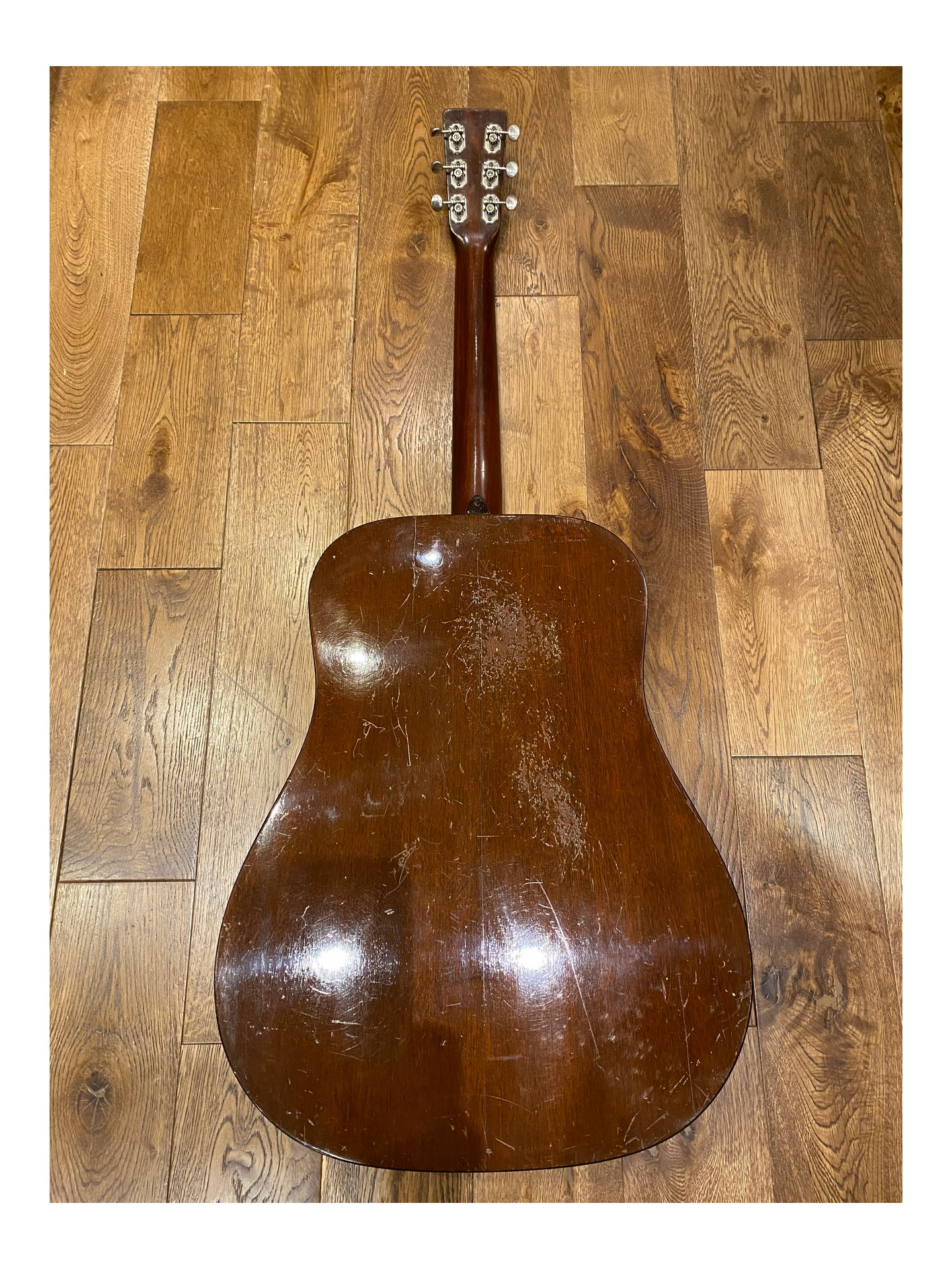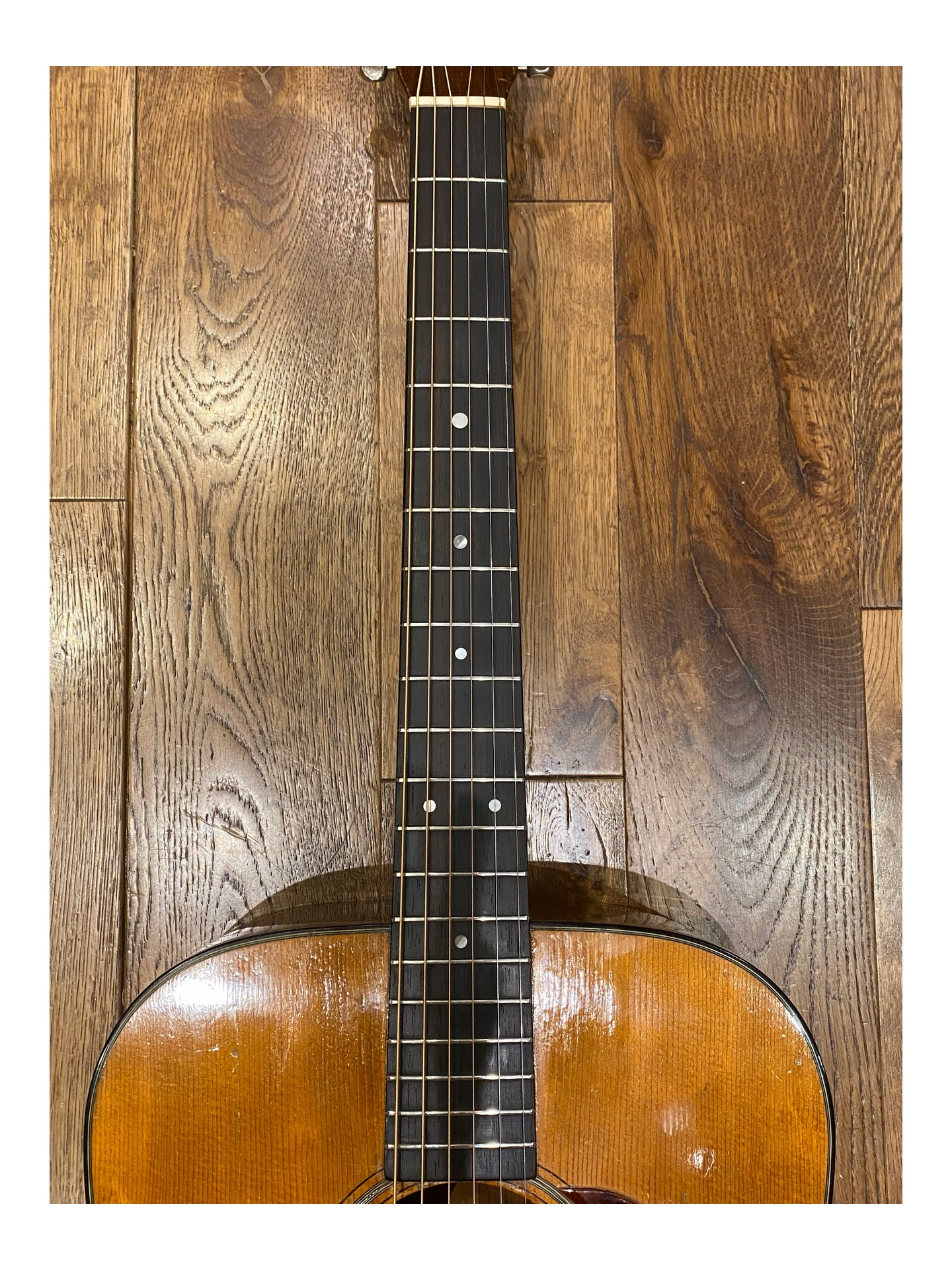 Cette D-18 présente les caractéristiques classiques du modèle, largement imité par d’autres fabricants au fil des décennies. Le dos et les éclisses sont en acajou du Honduras et la table est en épicéa de Sitka à grain serré, bordée à l’extérieur de celluloïd tortoise. Le manche est assez fin, légèrement arrondi à l’arrière, mais présente un profil nettement plus prononcé au niveau des épaules, qui prend une forme en « V » doux à mesure qu’il se rapproche du corps. La touche en palissandre et comporte des incrustations de points en nacre de différentes tailles. La tête est équipée de mécaniques Kluson individuelles à plaque large et à dos ouvert, spécifiques à cette époque, recouvertes de palissandre et ornées du logo Martin doré. La guitare a été refrettée et le chevalet a été recollé. De plus, elle vient de bénéficier d’un Neck Reset pour une jouabilité optimale. Il y a de nombreuses marques de jeu, témoignant de ses 76 ans. Enfin, il y a le typique « crack » stabilisé entre le chevalet et le pickguard, du à la rétractation de ce dernier.