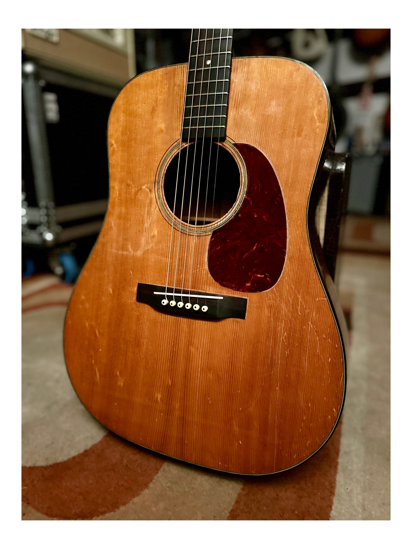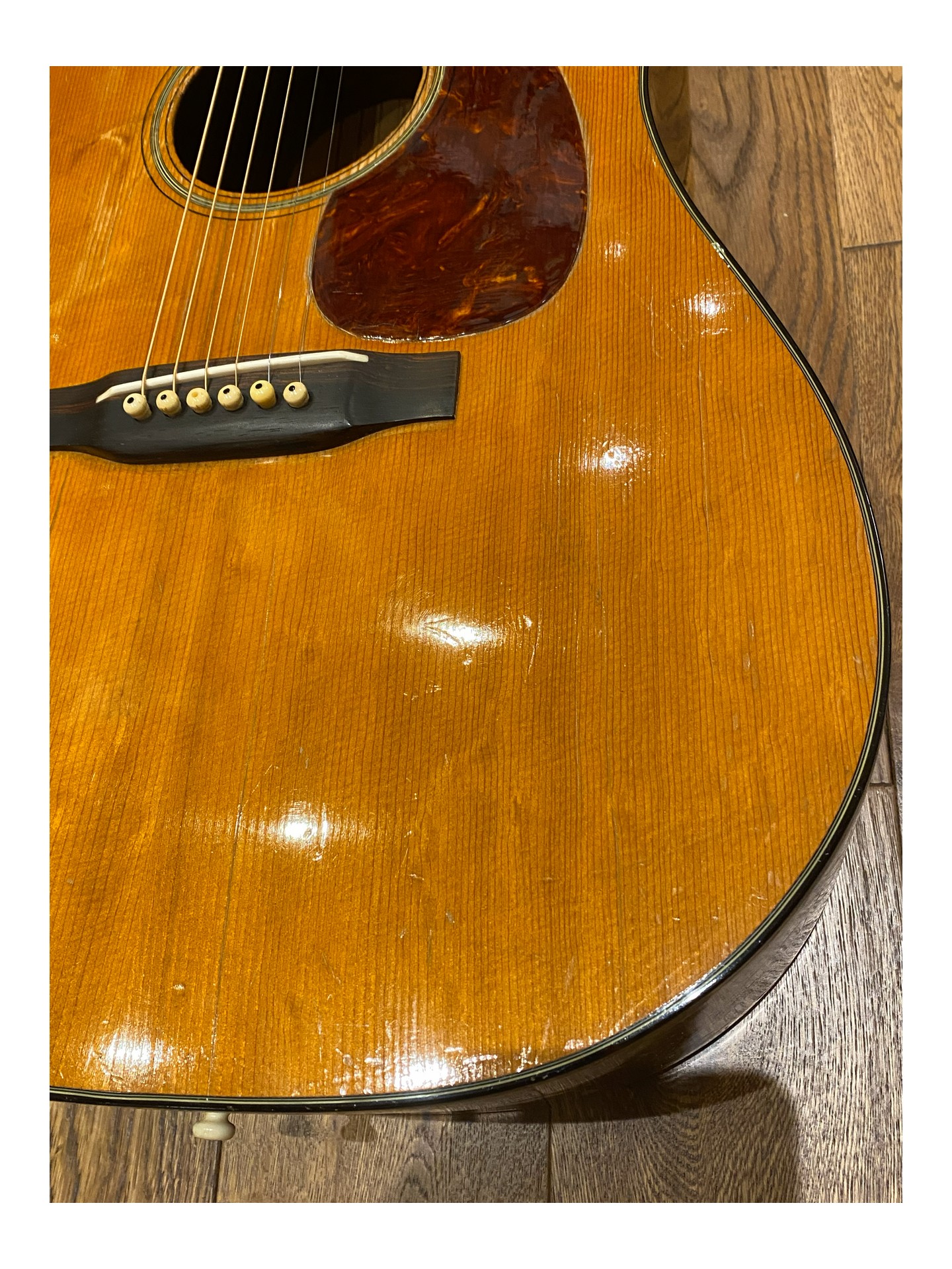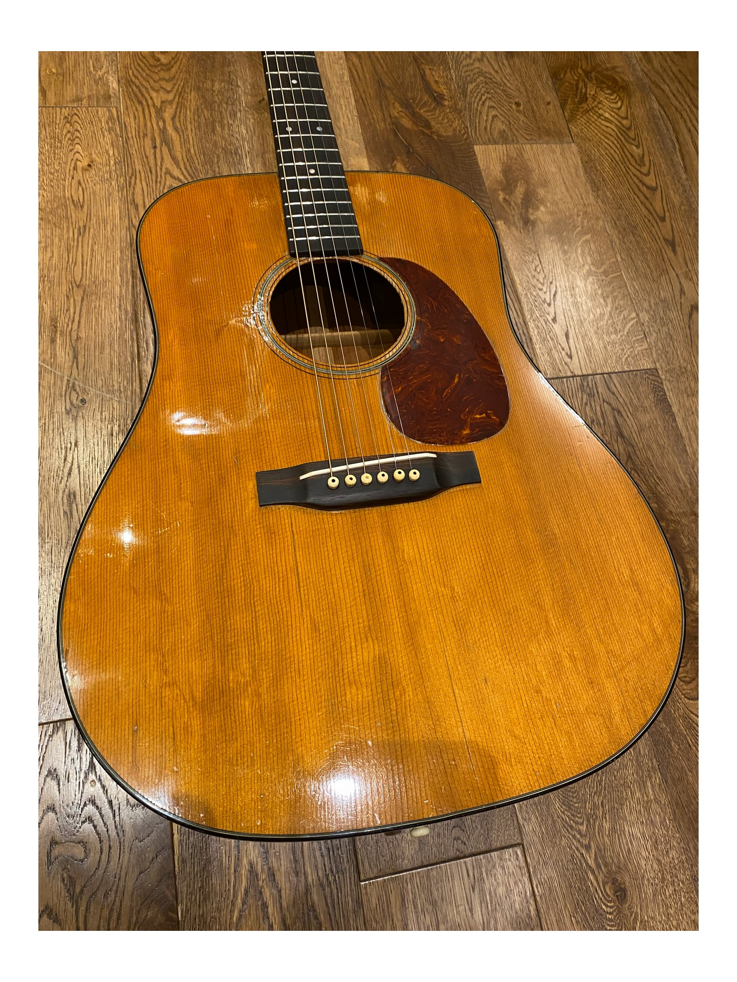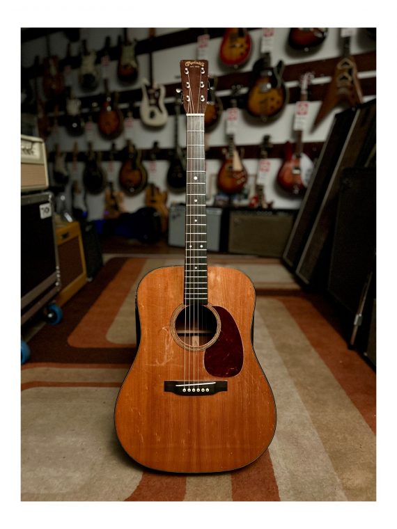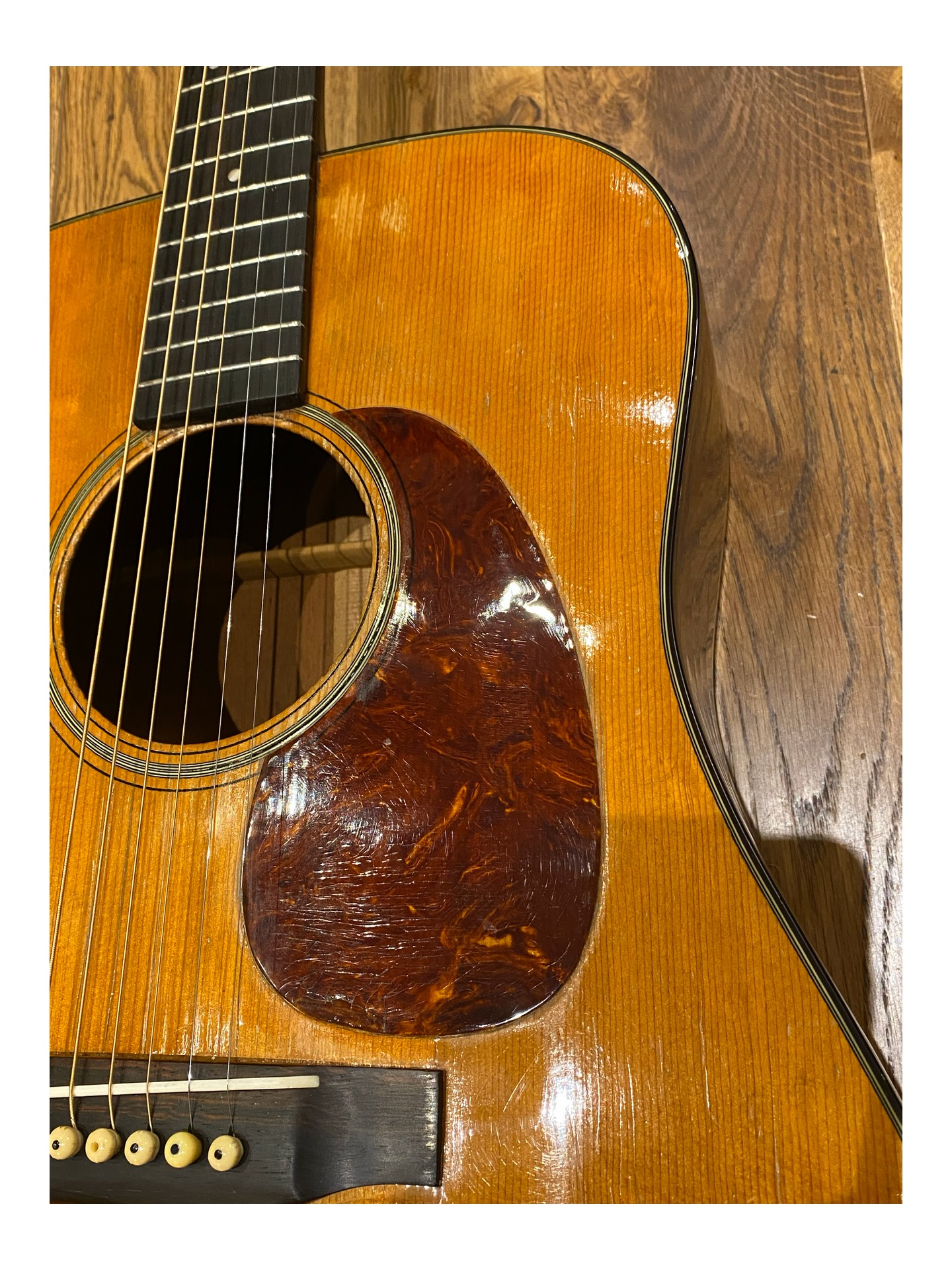 Cette D-18 présente les caractéristiques classiques du modèle, largement imité par d’autres fabricants au fil des décennies. Le dos et les éclisses sont en acajou du Honduras et la table est en épicéa de Sitka à grain serré, bordée à l’extérieur de celluloïd tortoise. Le manche est assez fin, légèrement arrondi à l’arrière, mais présente un profil nettement plus prononcé au niveau des épaules, qui prend une forme en « V » doux à mesure qu’il se rapproche du corps. La touche en palissandre et comporte des incrustations de points en nacre de différentes tailles. La tête est équipée de mécaniques Kluson individuelles à plaque large et à dos ouvert, spécifiques à cette époque, recouvertes de palissandre et ornées du logo Martin doré. La guitare a été refrettée et le chevalet a été recollé. De plus, elle vient de bénéficier d’un Neck Reset pour une jouabilité optimale. Il y a de nombreuses marques de jeu, témoignant de ses 76 ans. Enfin, il y a le typique « crack » stabilisé entre le chevalet et le pickguard, du à la rétractation de ce dernier.