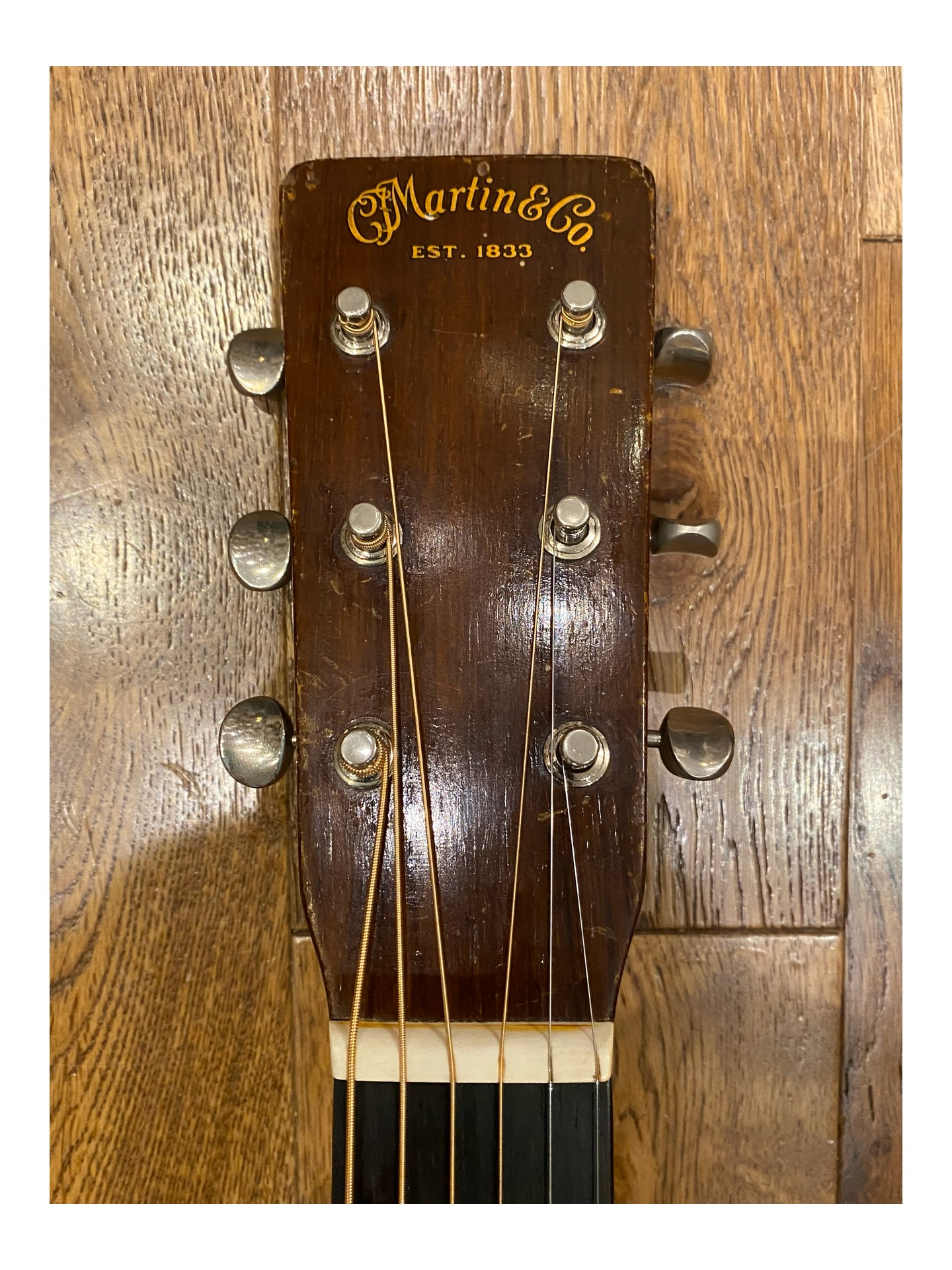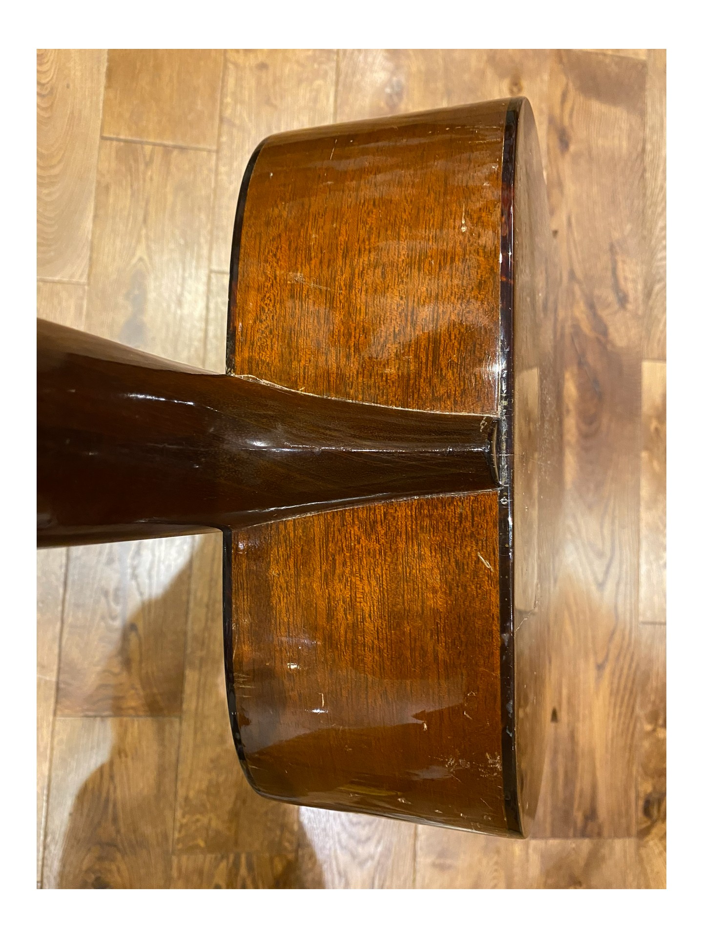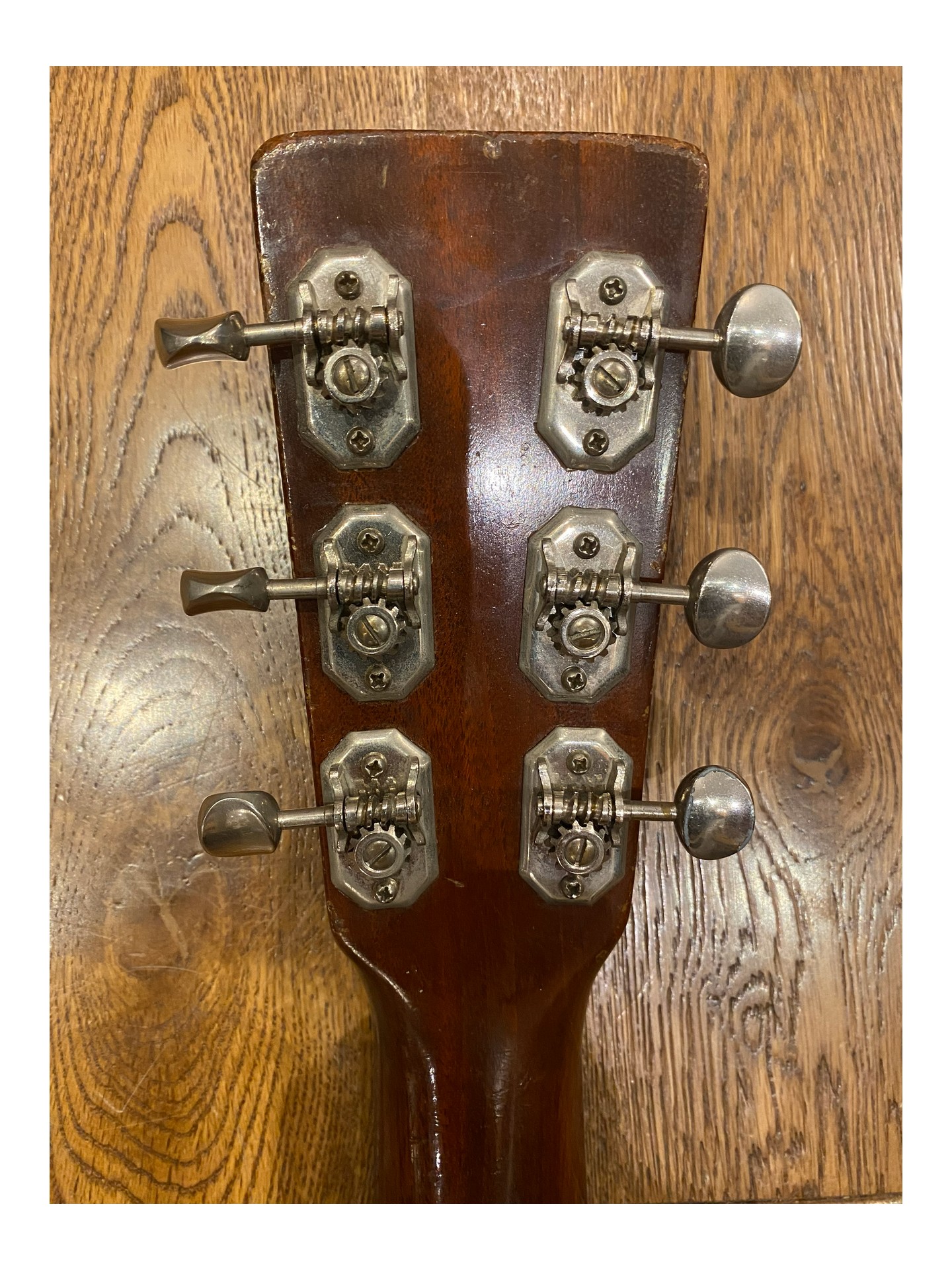 This D-18 features the classic characteristics of the model, widely imitated by other manufacturers over the decades. The back and sides are made of Honduran mahogany and the top is made of tight-grained Sitka spruce, edged on the outside with tortoise celluloid. The neck is fairly thin, slightly rounded at the back, but has a much more pronounced profile at the shoulders, which takes on a soft “V” shape as it approaches the body. The fingerboard is rosewood and features mother-of-pearl dot inlays of various sizes. The headstock is equipped with individual Kluson open-back wide-plate tuners, specific to this era, covered in rosewood and adorned with the gold Martin logo. The guitar has been refretted and the bridge has been re-glued. In addition, it has just undergone a neck reset for optimal playability. There are numerous signs of wear, reflecting its 76 years of age. Finally, there is the typical stabilized “crack” between the bridge and the pickguard, due to the retraction of the pickguard.
