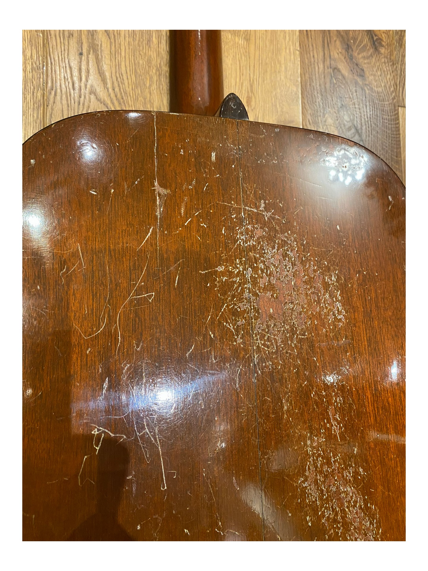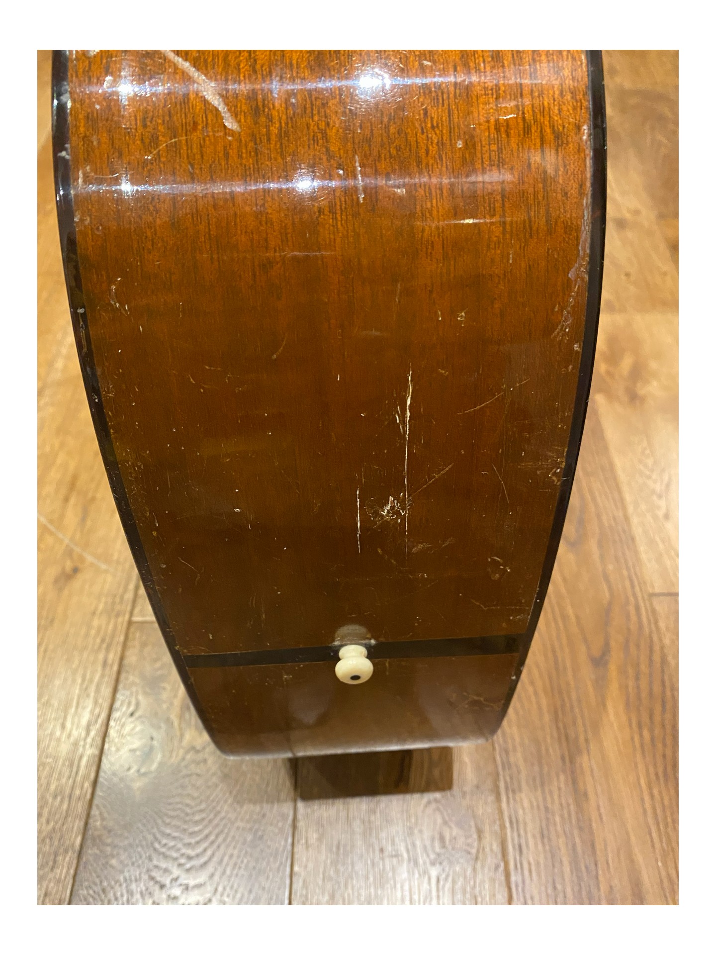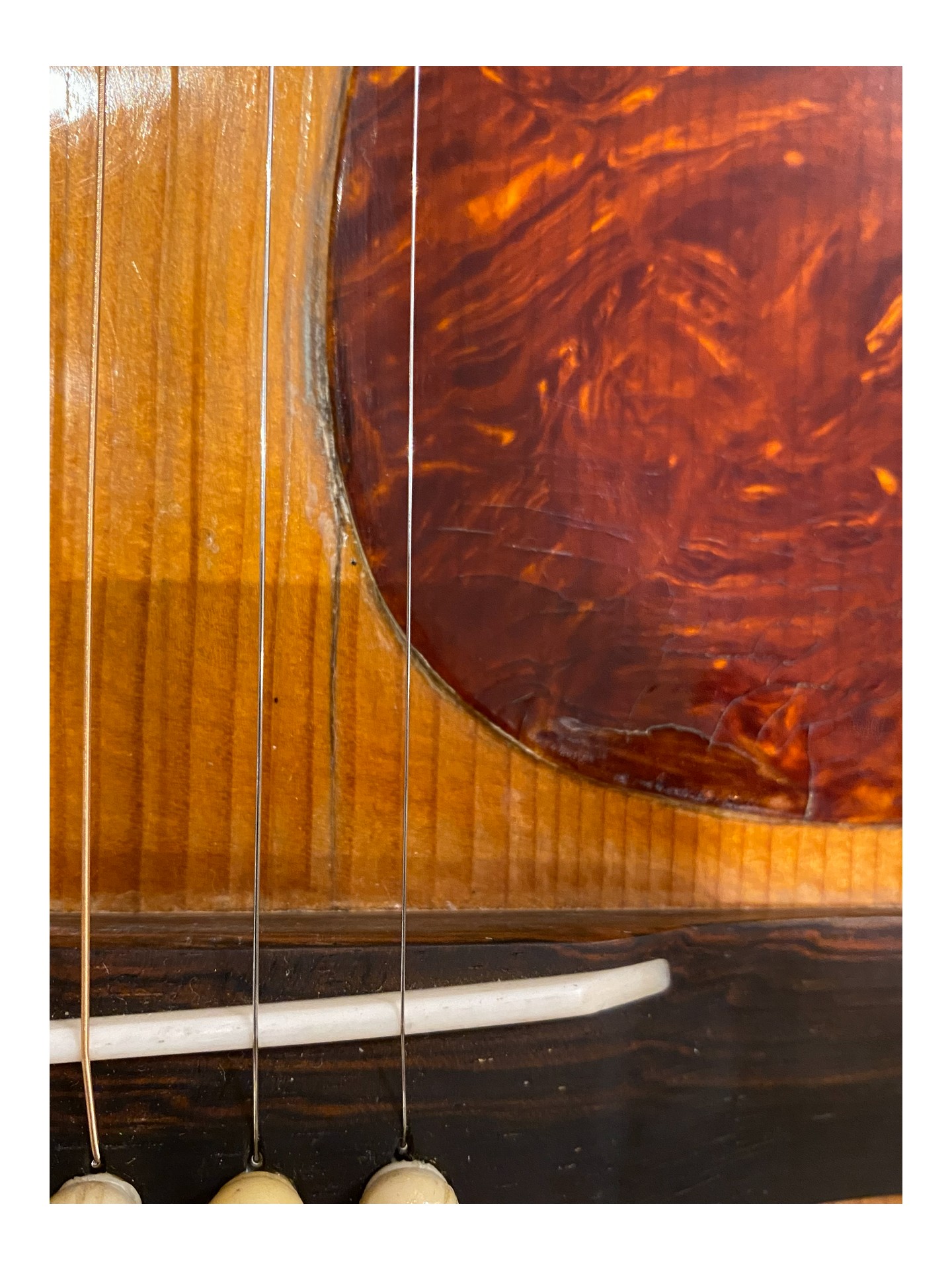This D-18 features the classic characteristics of the model, widely imitated by other manufacturers over the decades. The back and sides are made of Honduran mahogany and the top is made of tight-grained Sitka spruce, edged on the outside with tortoise celluloid. The neck is fairly thin, slightly rounded at the back, but has a much more pronounced profile at the shoulders, which takes on a soft “V” shape as it approaches the body. The fingerboard is rosewood and features mother-of-pearl dot inlays of various sizes. The headstock is equipped with individual Kluson open-back wide-plate tuners, specific to this era, covered in rosewood and adorned with the gold Martin logo. The guitar has been refretted and the bridge has been re-glued. In addition, it has just undergone a neck reset for optimal playability. There are numerous signs of wear, reflecting its 76 years of age. Finally, there is the typical stabilized “crack” between the bridge and the pickguard, due to the retraction of the pickguard.