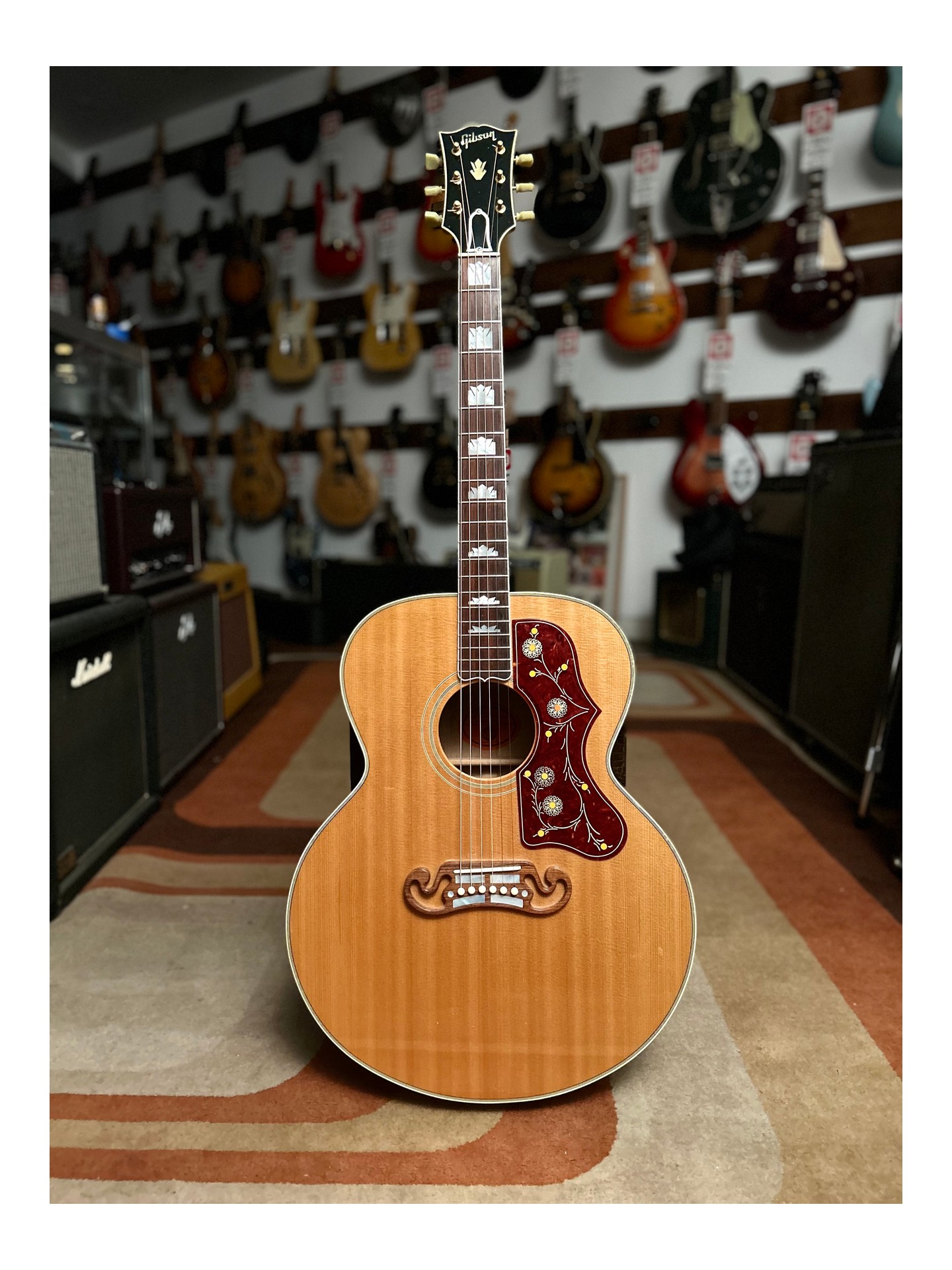 The vintage-style binding, ornate pickguard, and crown inlays add a touch of elegance to the SJ-200’s appearance.