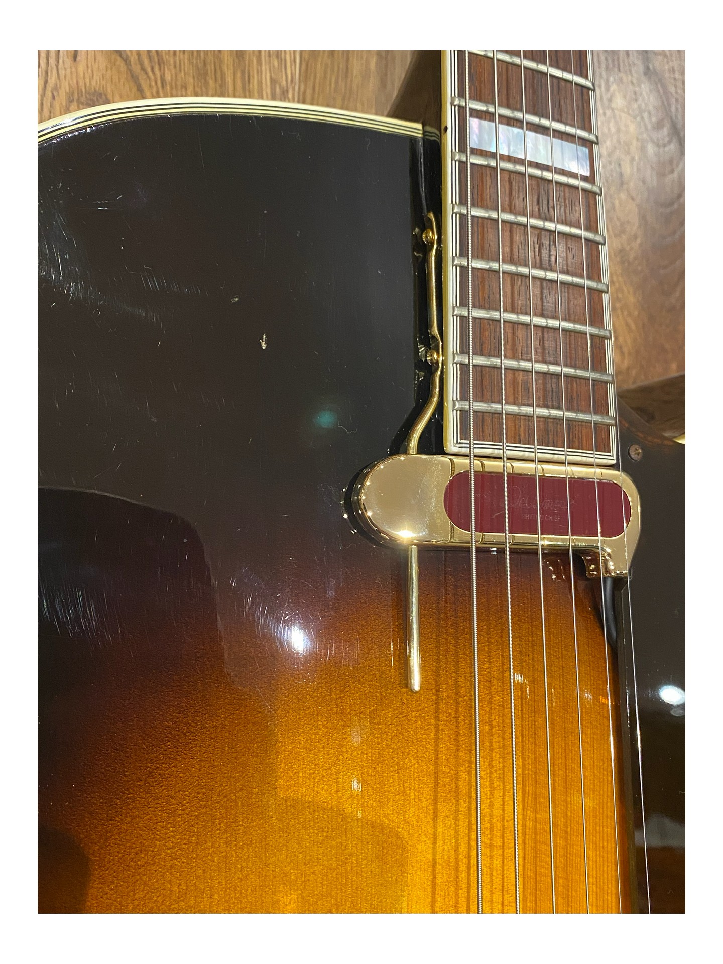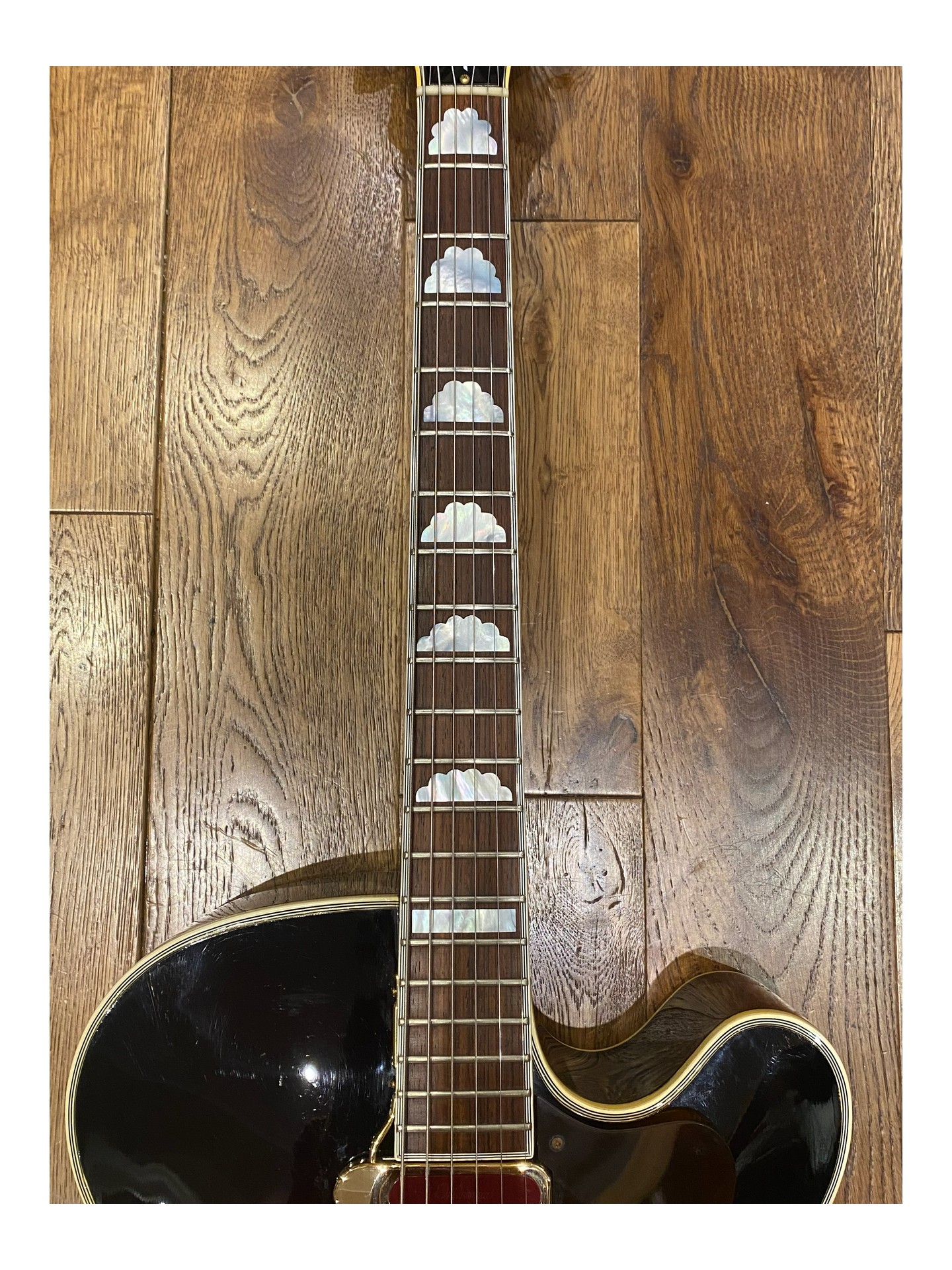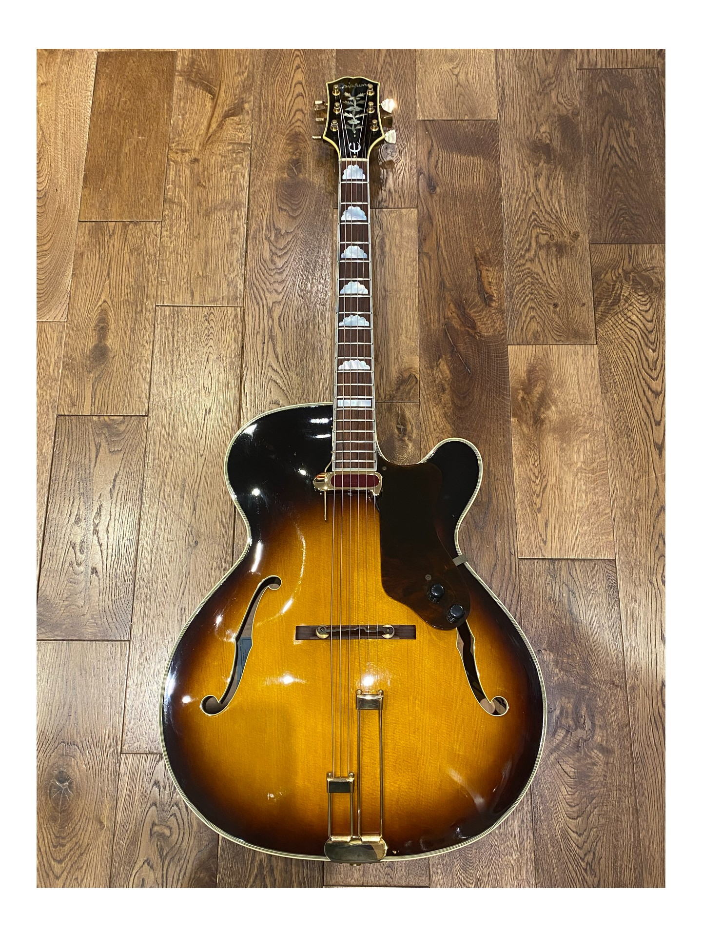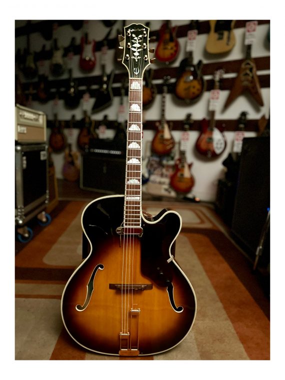 L’une des dernières guitares archtop Epiphone Deluxe expédiées depuis l’usine de Kalamazoo et toujours fabriquée par Gibson aux États-Unis, juste avant les premières productions japonaises. Numéro de modèle A212. Cette guitare présente un corps de 17 3/4 pouces de large, un pan coupé arrondi, un cordier original               « Frequensator », une touche en palissandre avec incrustations « cloud », une incrustation en forme de vigne sur la tête, un superbe dos en érable flammé.et une plaque de protection. Le pickguard d’origine est fourni dans l’étui. Elle a été équipée d’un nouveau pickguard avec un micro DeArmond Rythm Chief afin de la jouer électrique. En parfait état d’origine et très propre (9/10), c’est une guitare archtop qui joue et sonne très bien.