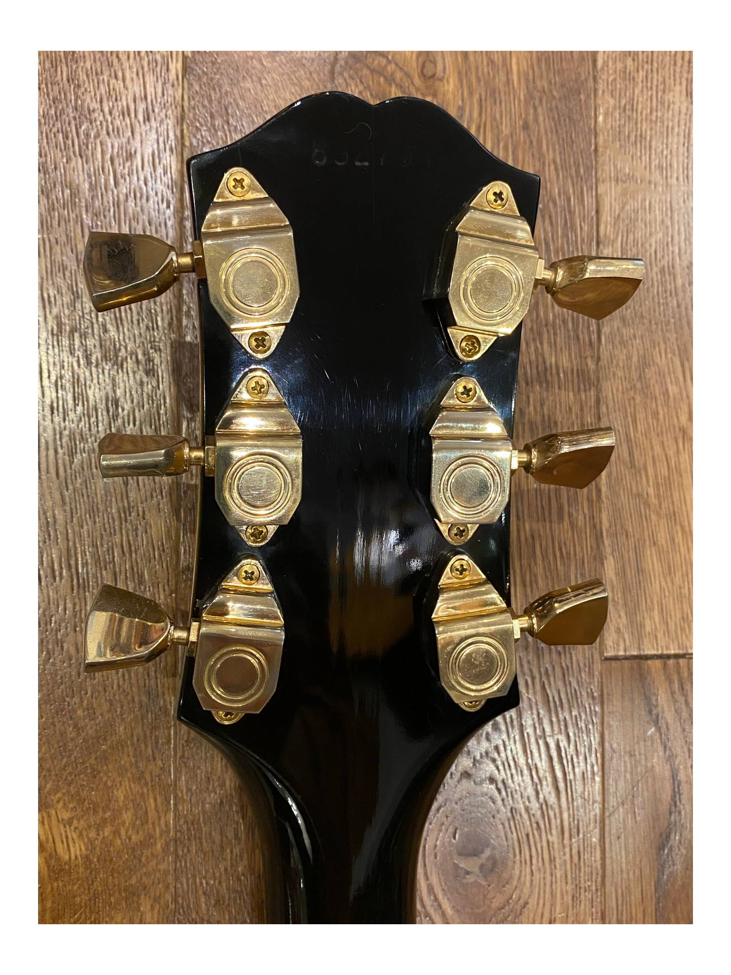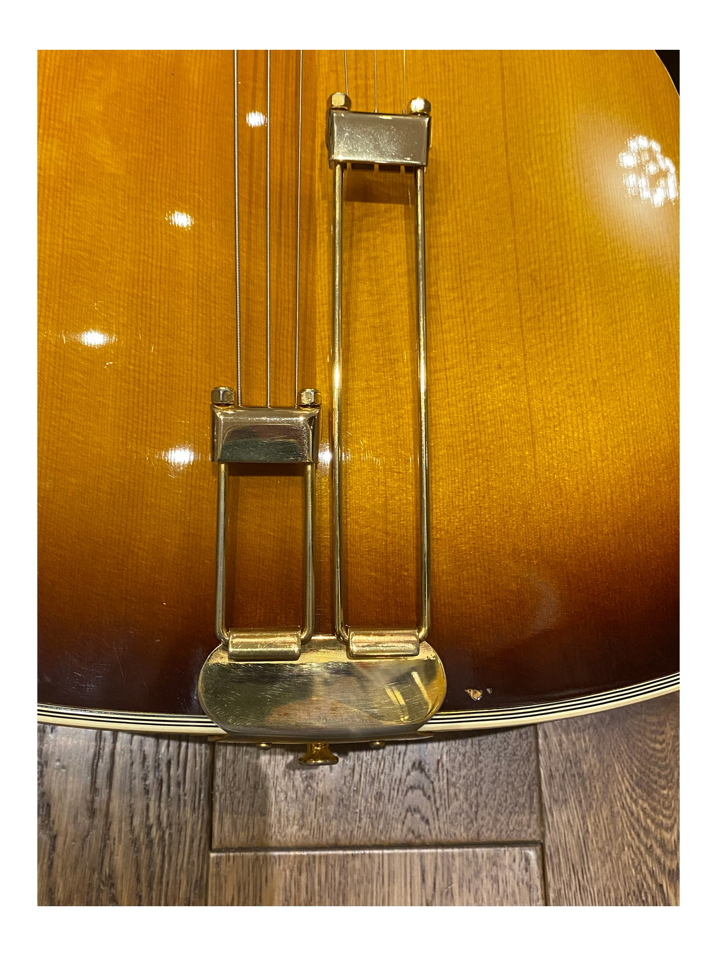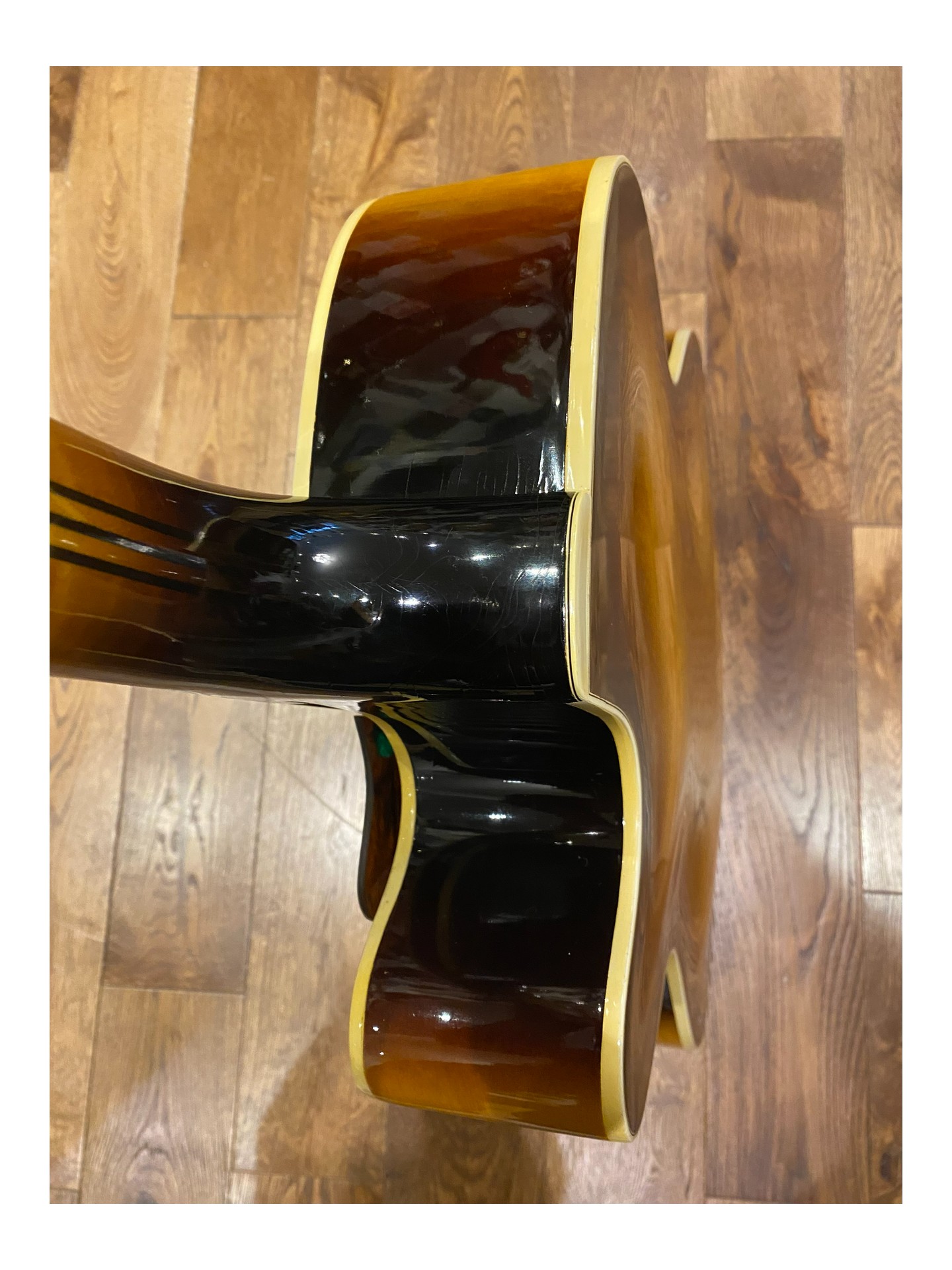 L’une des dernières guitares archtop Epiphone Deluxe expédiées depuis l’usine de Kalamazoo et toujours fabriquée par Gibson aux États-Unis, juste avant les premières productions japonaises. Numéro de modèle A212. Cette guitare présente un corps de 17 3/4 pouces de large, un pan coupé arrondi, un cordier original               « Frequensator », une touche en palissandre avec incrustations « cloud », une incrustation en forme de vigne sur la tête, un superbe dos en érable flammé.et une plaque de protection. Le pickguard d’origine est fourni dans l’étui. Elle a été équipée d’un nouveau pickguard avec un micro DeArmond Rythm Chief afin de la jouer électrique. En parfait état d’origine et très propre (9/10), c’est une guitare archtop qui joue et sonne très bien.