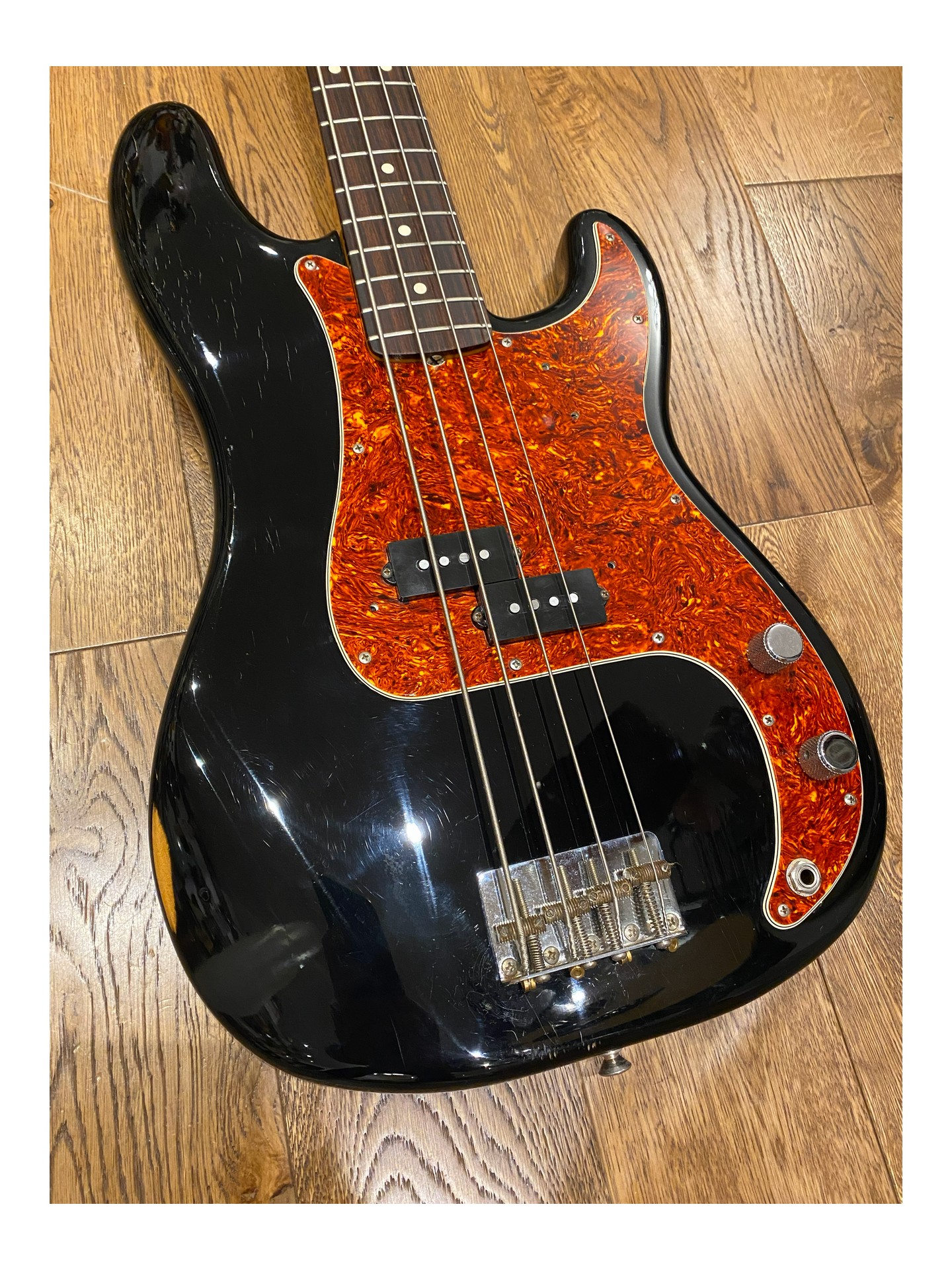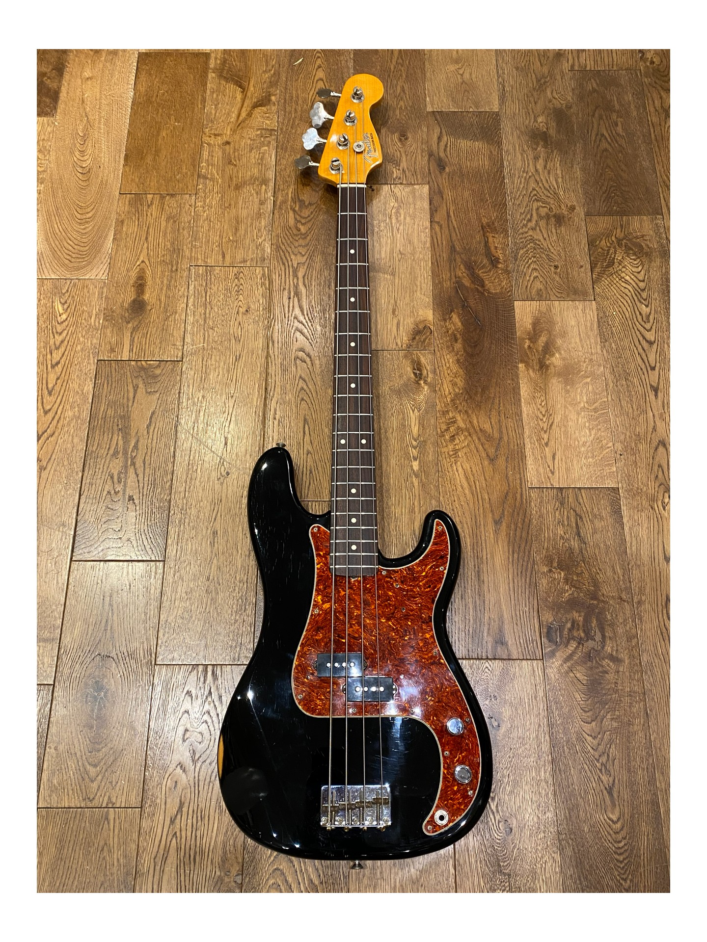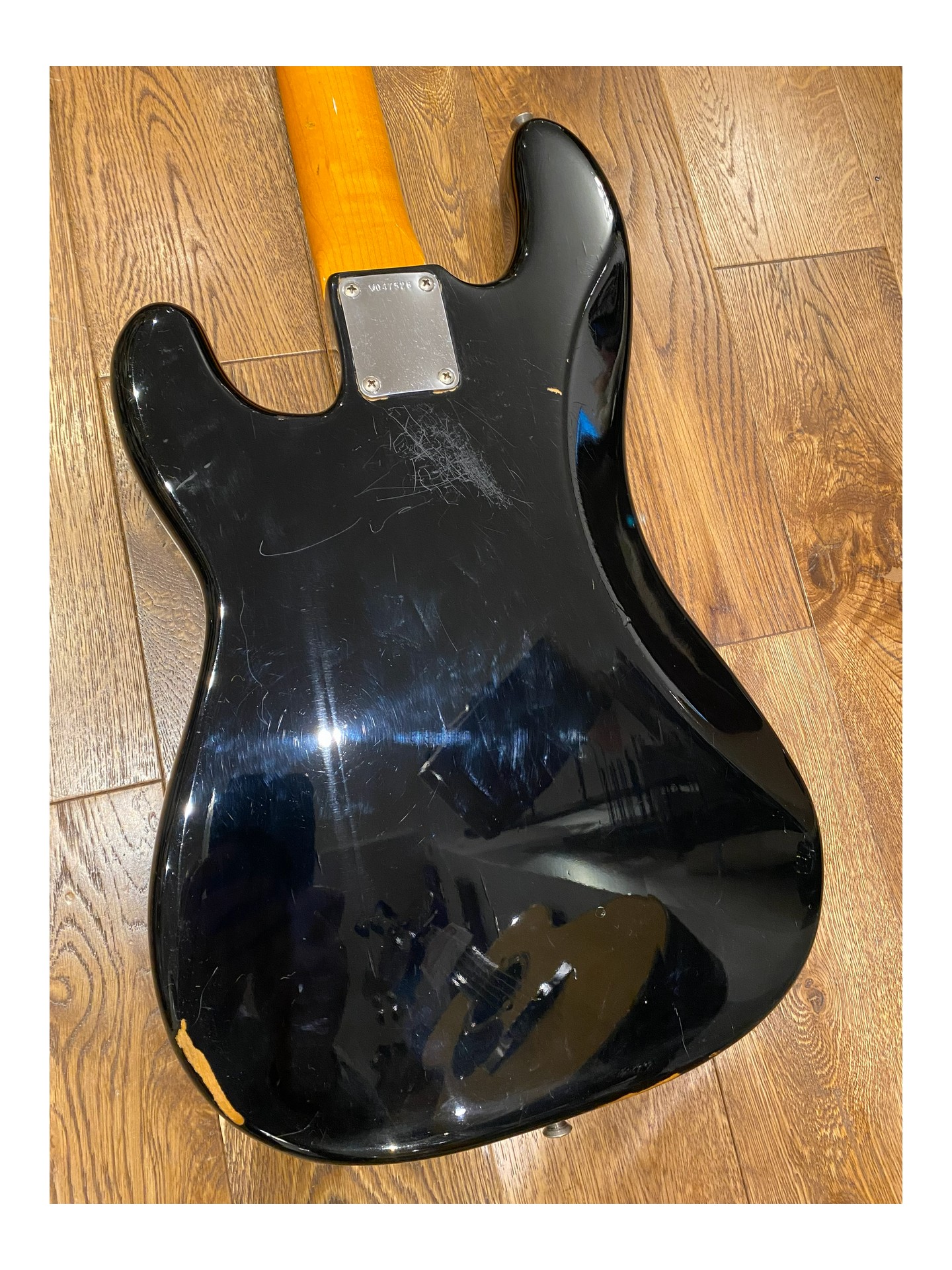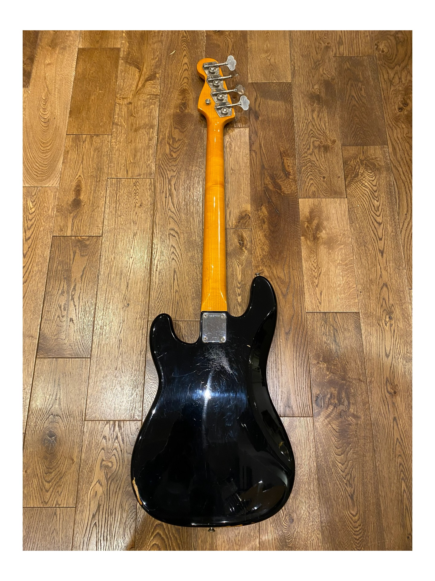 A superb Fender Precision Bass American Vintage ’62 Reissue, refinished in black, made in the USA in 1990. Produced for the Japanese market, as evidenced by the “Yamano” notebook included in its original Fender tweed hard case. Yamano is the Fender importer in Japan, whose selections are highly sought after and recognized as the best of US-made exports. An excellent Lollar P-Bass pickup has replaced the original pickup, which is also included in the case. This is a lightweight P-Bass (3.8kg) with remarkable sound. Excellent value for money!