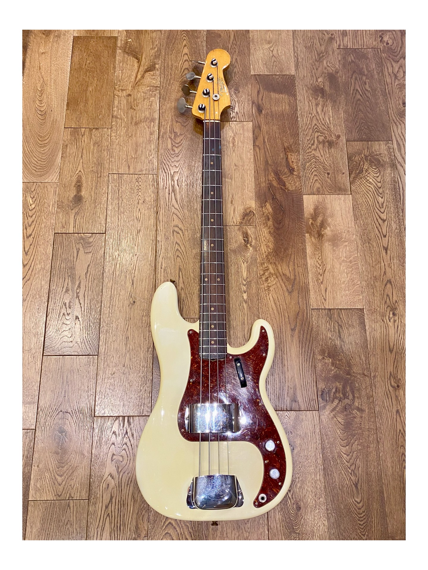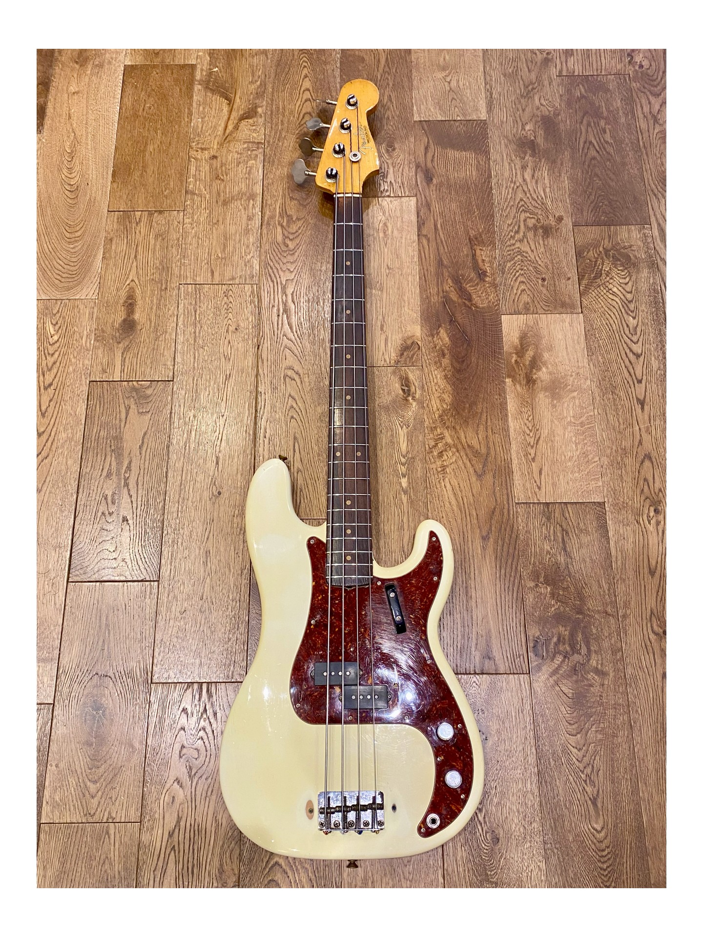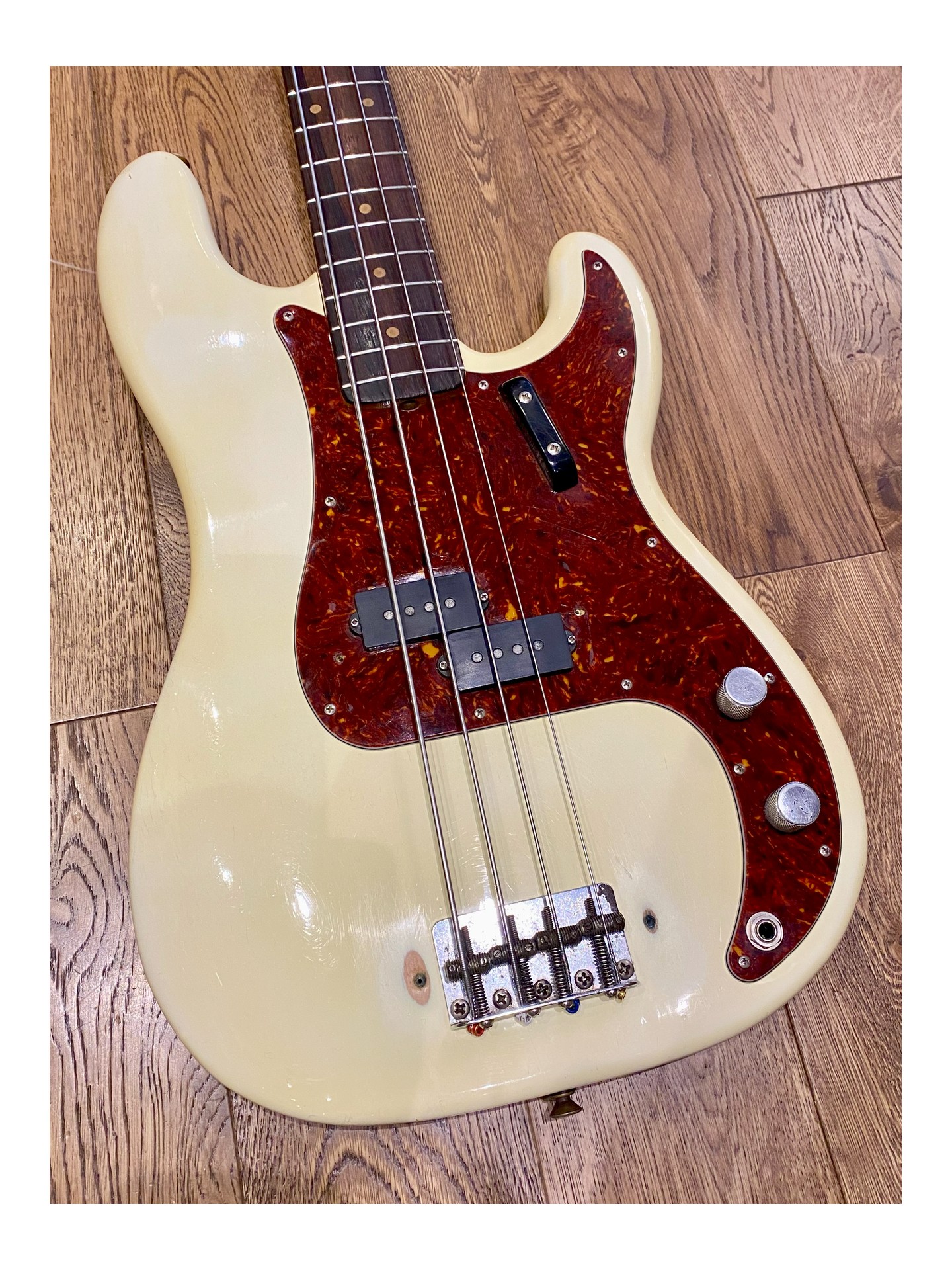 A 1963 Fender Precision Bass L Series in “player condition,” refinished in Olympic White, which sounds magnificent! If you want to follow in the footsteps of James Jamerson, Carole Kaye, Pino Palladino, Roger Waters, John Deacon, and so many others… This is the perfect bass!