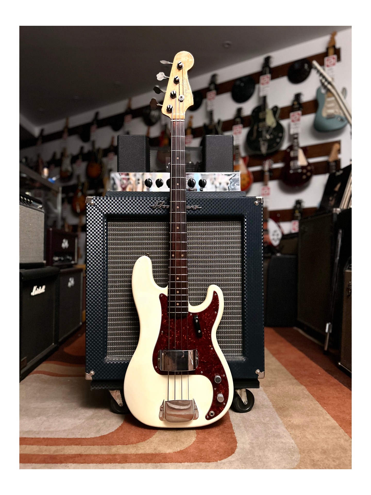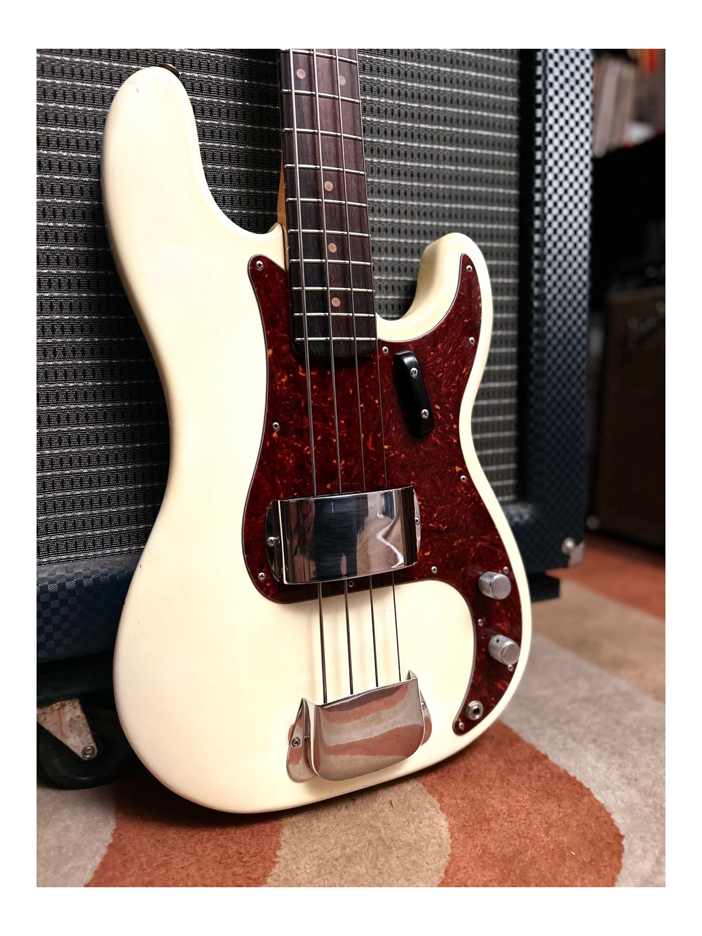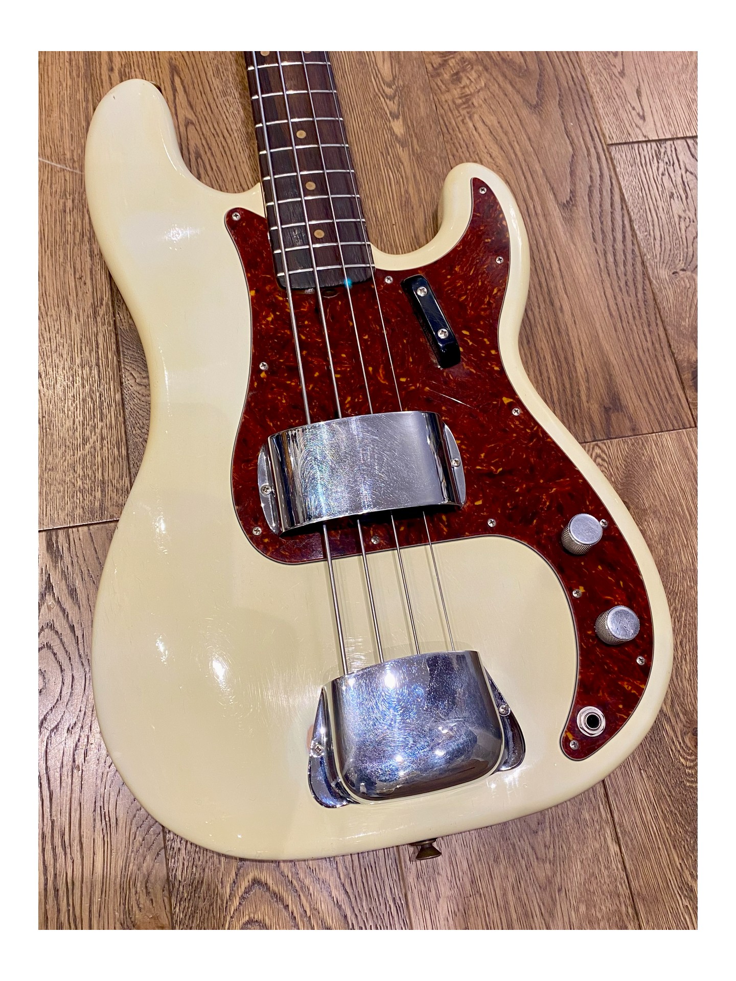 A 1963 Fender Precision Bass L Series in “player condition,” refinished in Olympic White, which sounds magnificent! If you want to follow in the footsteps of James Jamerson, Carole Kaye, Pino Palladino, Roger Waters, John Deacon, and so many others… This is the perfect bass!