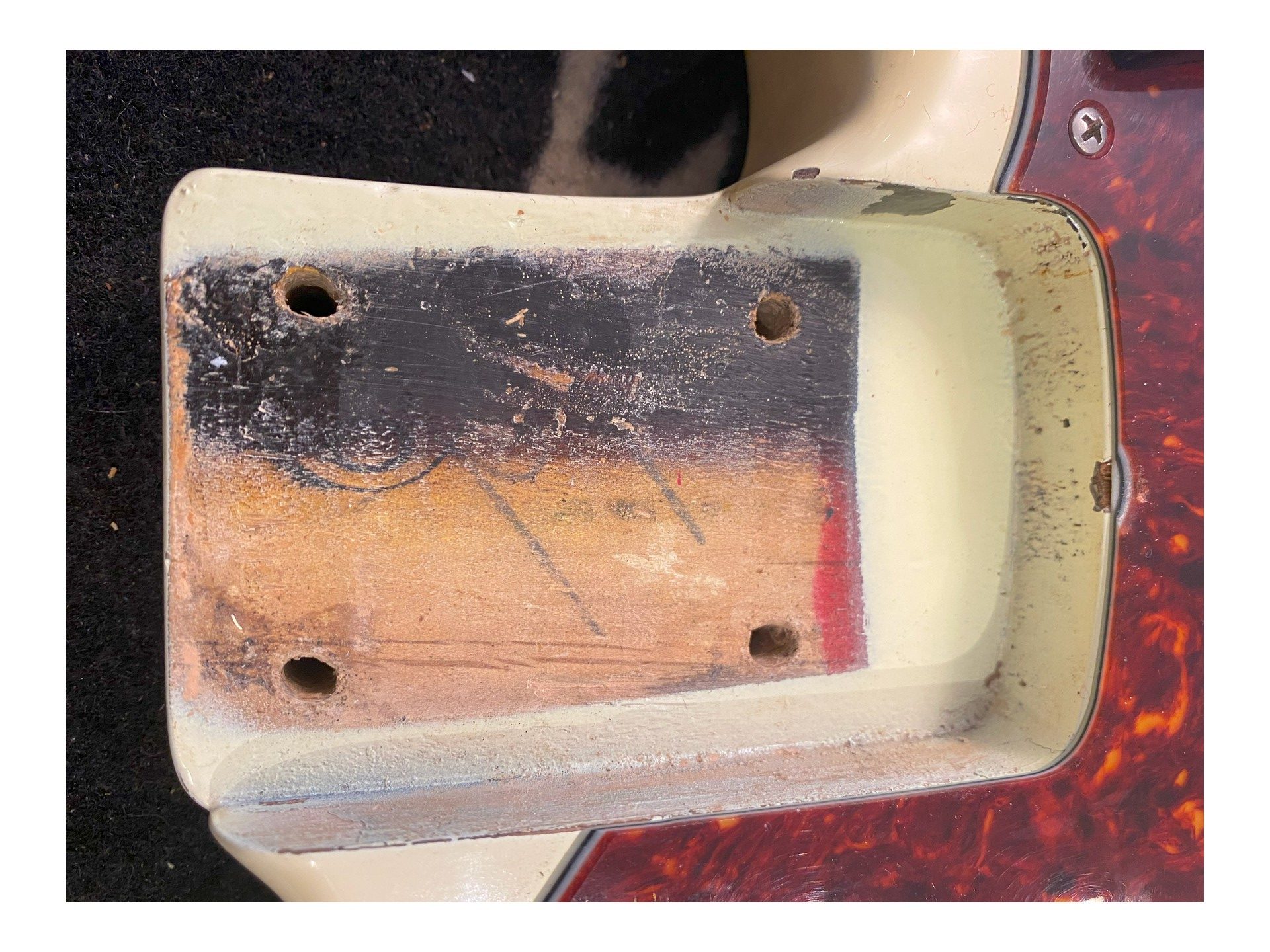 The pickguard, potentiometers, and case are not original, but the pickup is! The essentials are there: the wood, the bridge, the tuners, the knobs, and the pickup. The neck is dated November 1963 and the body December 1963.