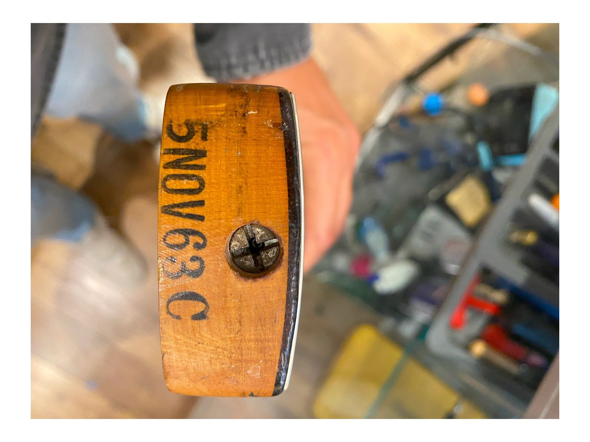 Le pickguard ainsi que les potentiomètres et l’étui ne sont pas d’origine mais le micro oui! L’essentiel est là, le bois, le chevalet, les mécaniques, les boutons et le pickup. Le manche est daté est de Novembre 1963 et le corps de décembre 1963.