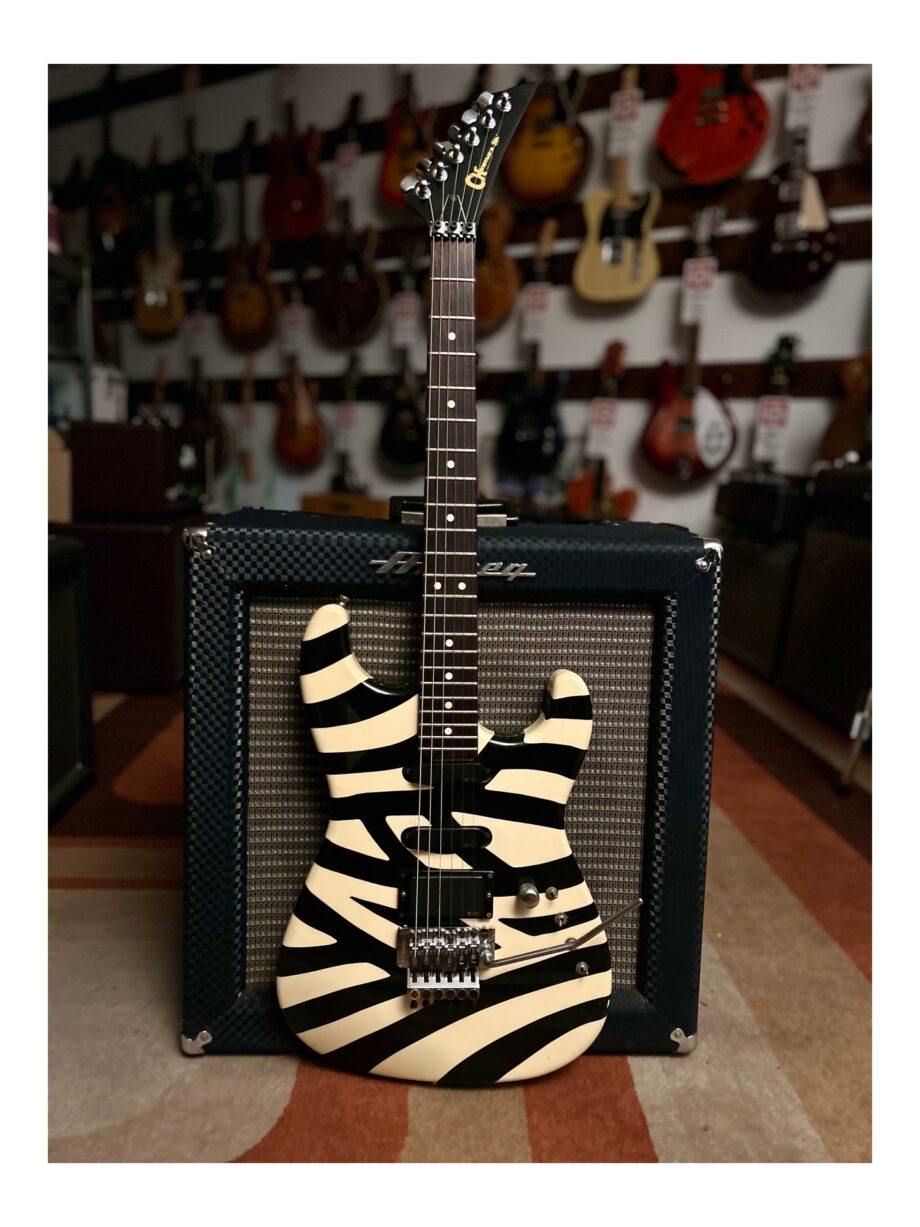 Voici une rare trouvaille! Une Charvel San Dimas de 1985 avec un floyd rose d’origine. (La grande majorité des guitares Charvel San Dimas vintage étaient équipées de Kahlers, car les floyd rose étaient des accessoires coûteux du fait que Kramer possédait les droits exclusifs de distribution des trems floyd rose dans les années 80). Avec sa très rare finition « zebra » et ses micros EMG, cette superbe Charvel vintage joue et sonne incroyablement bien! Elle est en excellente condition. Il n’y a pas de comparaison possible entre une Charvel USA vintage et les Charvel plus récentes fabriquées par Fender ! Toutes les San Dimas USA vintage sont très rares de nos jours et particulièrement recherchées par les collectionneurs. Livrée dans son étui d’origine.