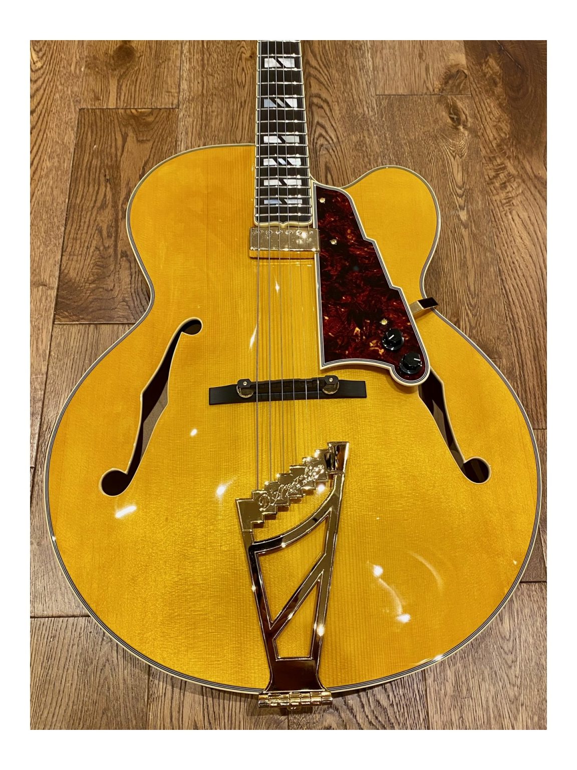 Stairstep, Grover 150 Imperial tuners, Scalini Pickguard (5-ply) D’Angelico Electrozinc Jazz 12’s (12-52) strings,