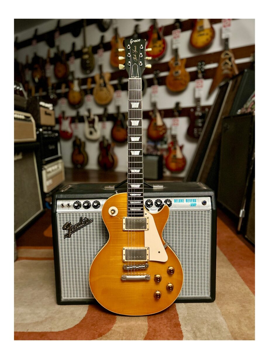 A Greco Les Paul “Rock Spirit” made in Fujigen, Japan, in 1985, in very good condition. Mahogany body, maple top, glued mahogany neck, rosewood fingerboard. Comes in a Lifton reissue hard case.