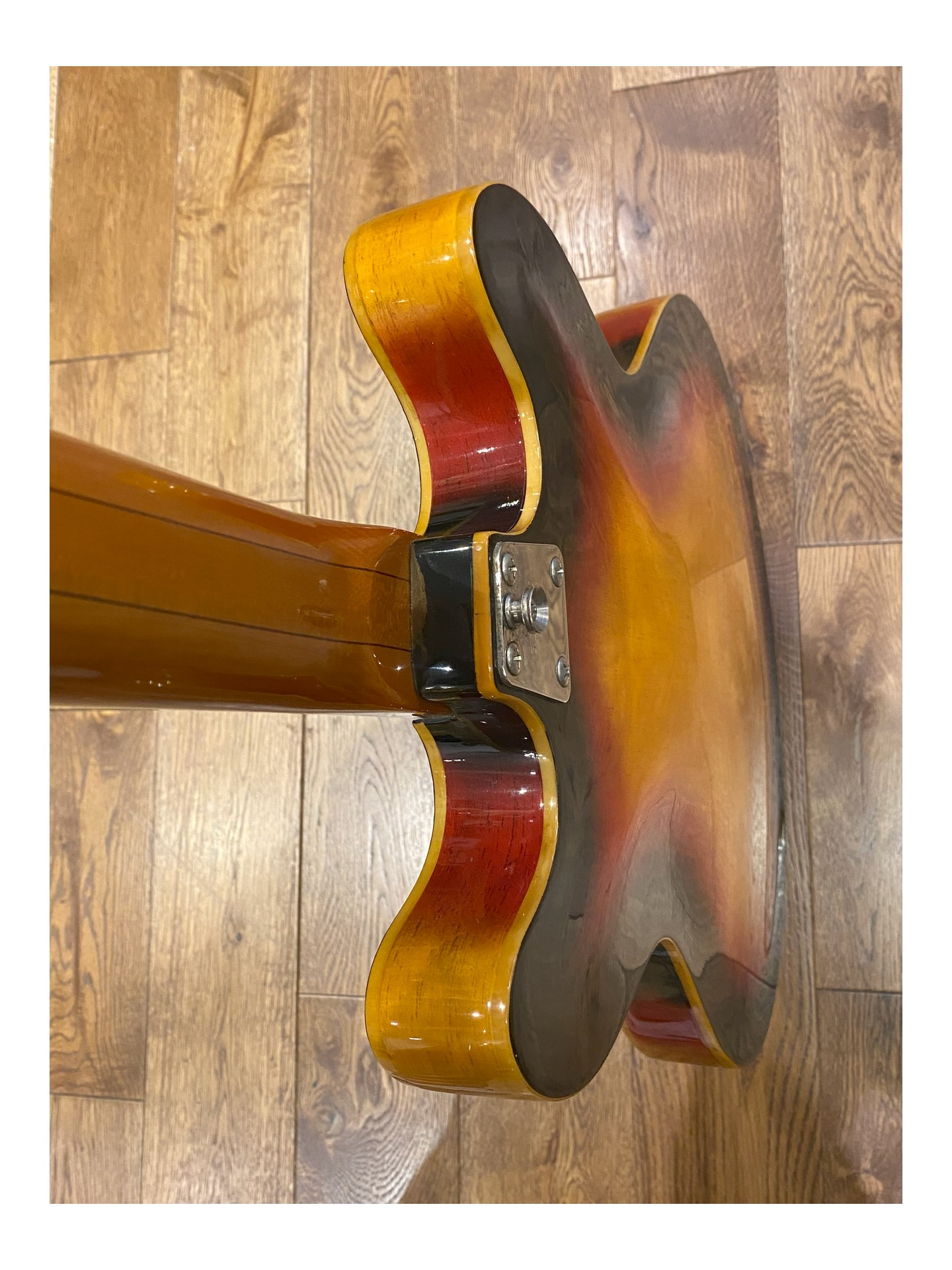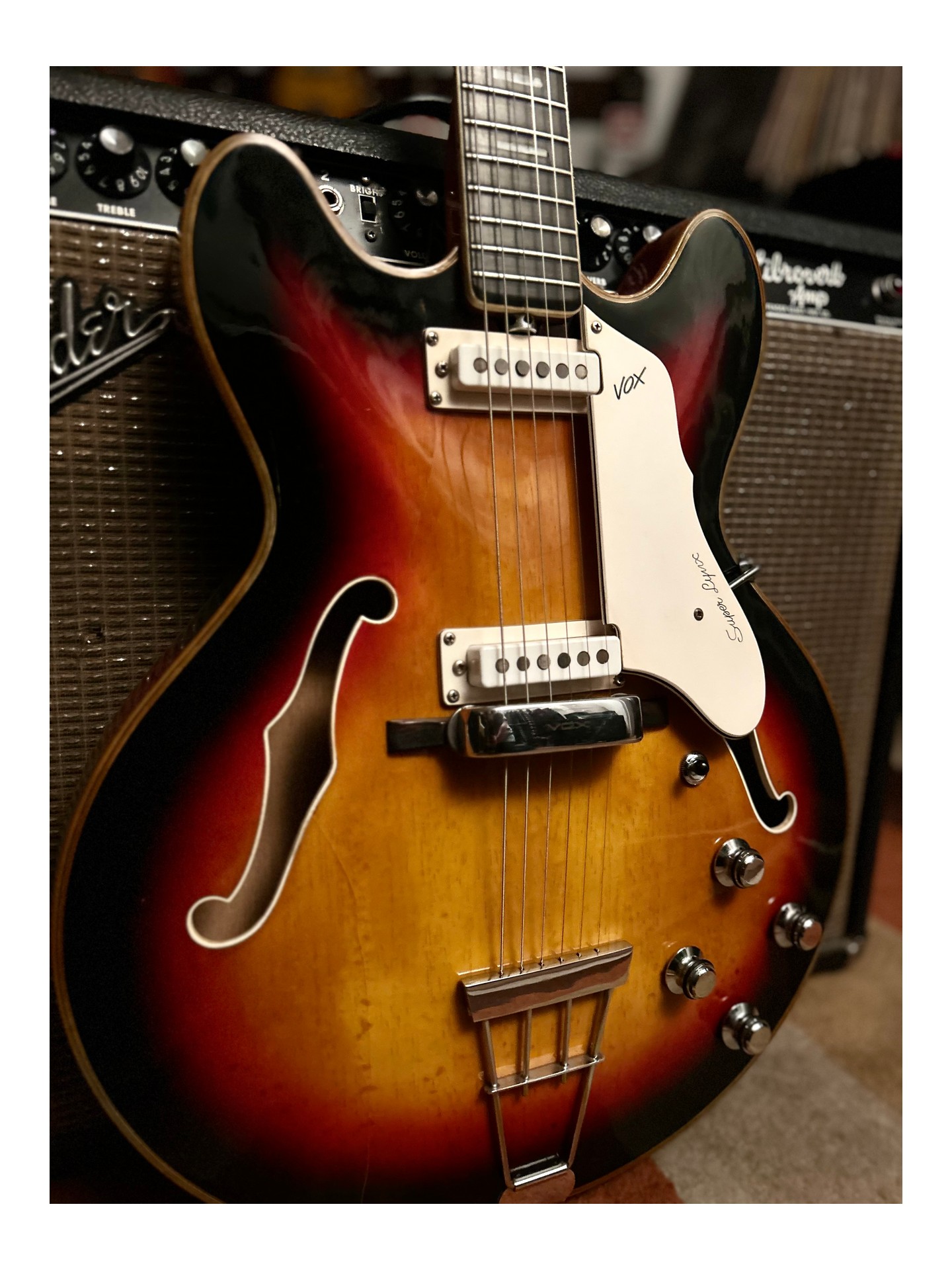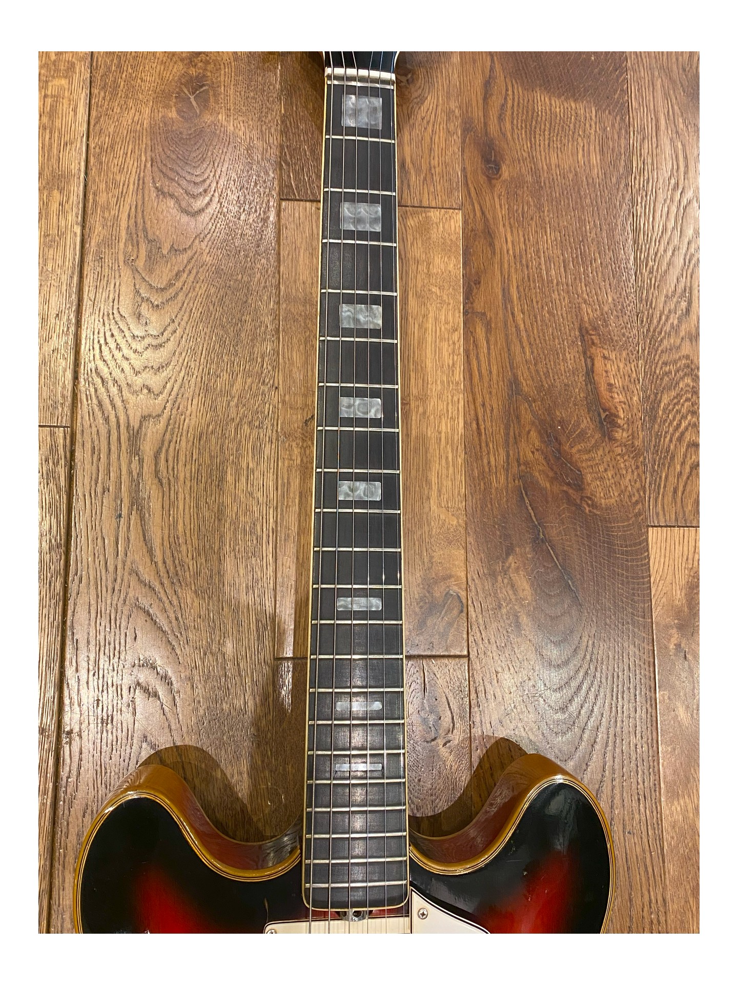Rare VOX V243 Super Lynx de 1967, Comme celle utilisée par Jimmy Nolen, Ella Rae Feingold, Kamil Rustam, Etc… Fabriquée en Italie, avec une finition Sunburst. L’instrument est entièrement d’origine. Elle a été jouée au fil des années ce qui lui confère un joli et léger craquèlement du vernis. Corps léger en érable de 2 pouces avec double pan coupé, équipé de 2 micros simple bobinage EKO. Le manche vissé en érable, fin, avec touche en palissandre bordée, comporte 21 frettes encore en très bon état et offre une excellente jouabilité. Une belle guitare vintage abordable, en excellent état malgré ses plus de 58 ans. Livrée en étui rigide non original