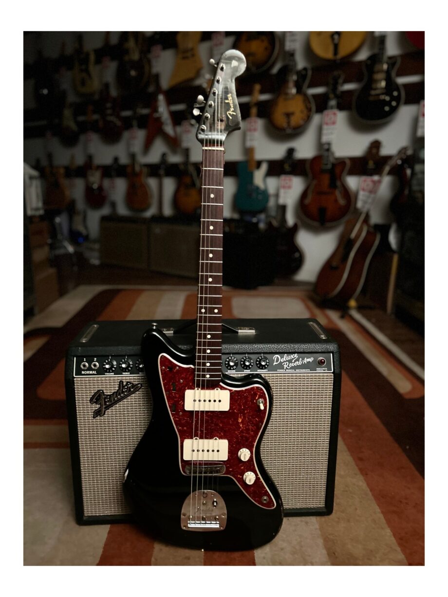 Superbe Jazzmaster Relic ’62 Custom Shop de 2008 en finition noire avec matching headstock en excellent état. Et quel son ! Le Pickguard « tortoise » de chez Spitfire a été rajouté, mais l’original est également fourni. Elle est accompagnée de son étui d’origine, de son certificat d’authenticité.