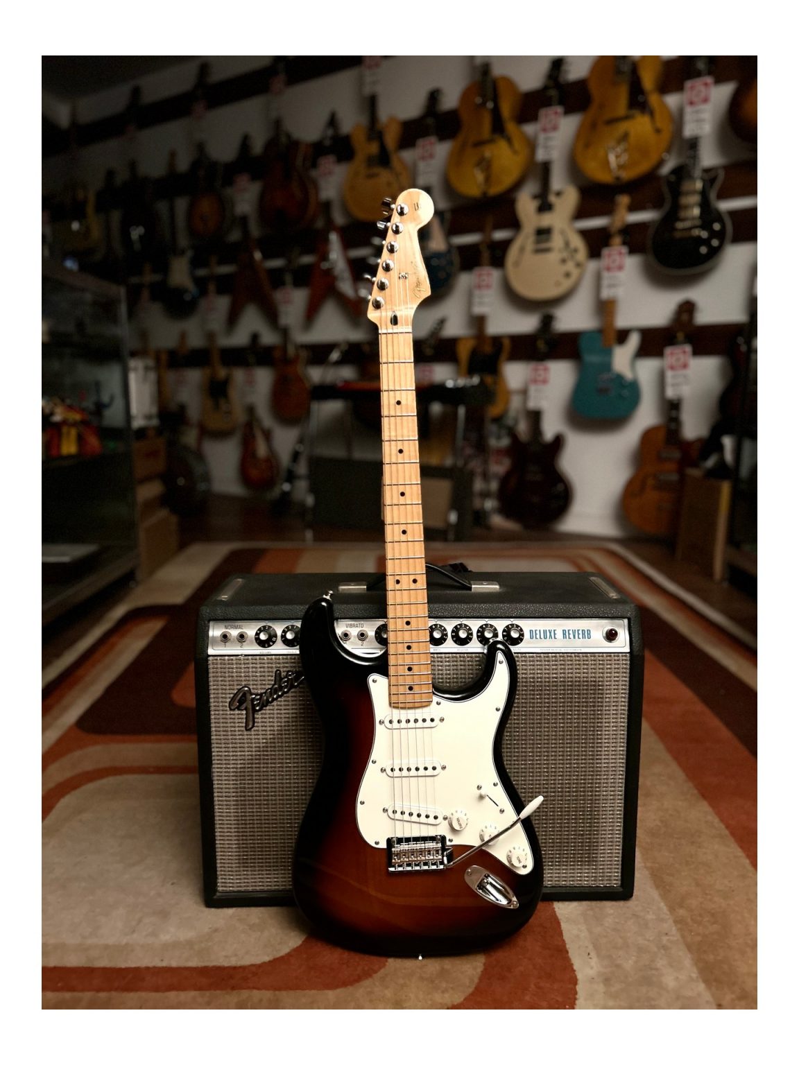 Une Fender Stratocaster Player 70th Anniversary d’occasion en parfait état.