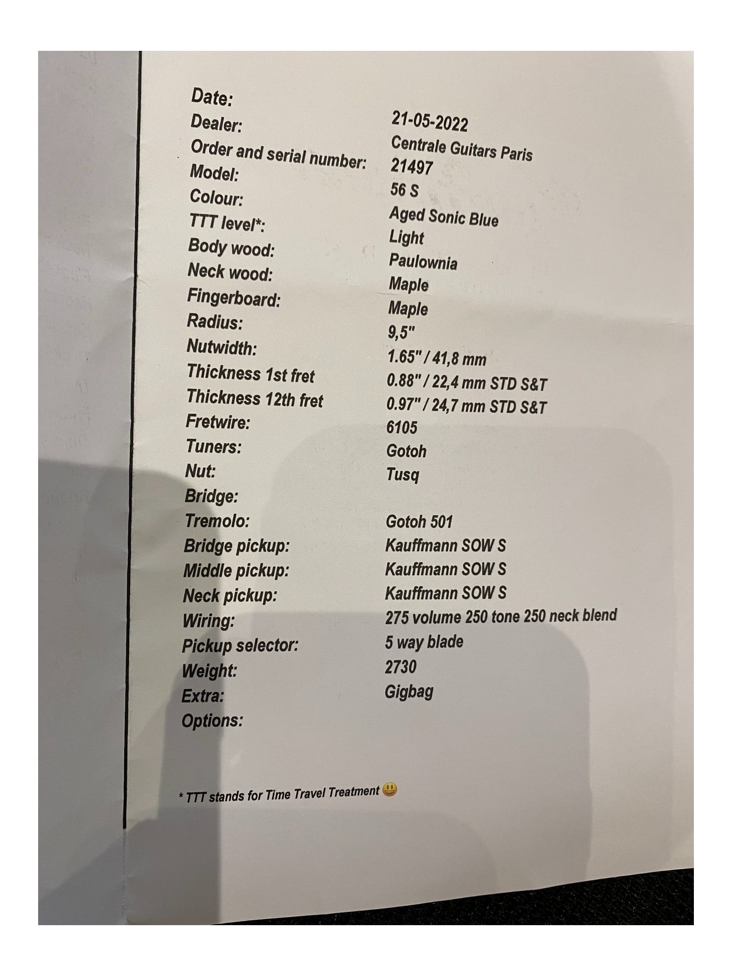 A 2022 KAUFFMANN STRAT 56 S AGED SONIC BLUE in perfect condition.