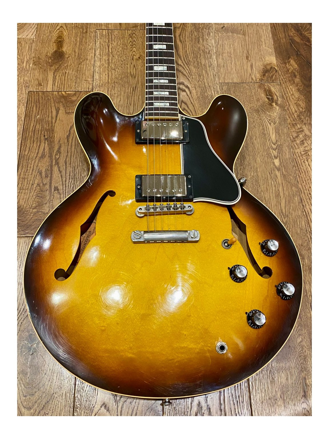 A beautiful Gibson Custom Historic ’63 ES-335 Reissue in very clean condition except for a professionally repaired broken headstock, which explains the reduced price. There is, of course, no impact on sound or playability. A small chip of finish on the jack plug (no breaks). From Block inlays to pinned ears, the ES-335 Historic Reissue ’63 is an excellent recreation of the incredibly sought-after original Gibson produced in the early sixties. Superb in a deep Vintage Sunburst finish with a dark rosewood fingerboard, the guitar plays and sounds great thanks to a pair of Gibson ’57 Classic’ pickups. Comes with the original case and certificate of authenticity.