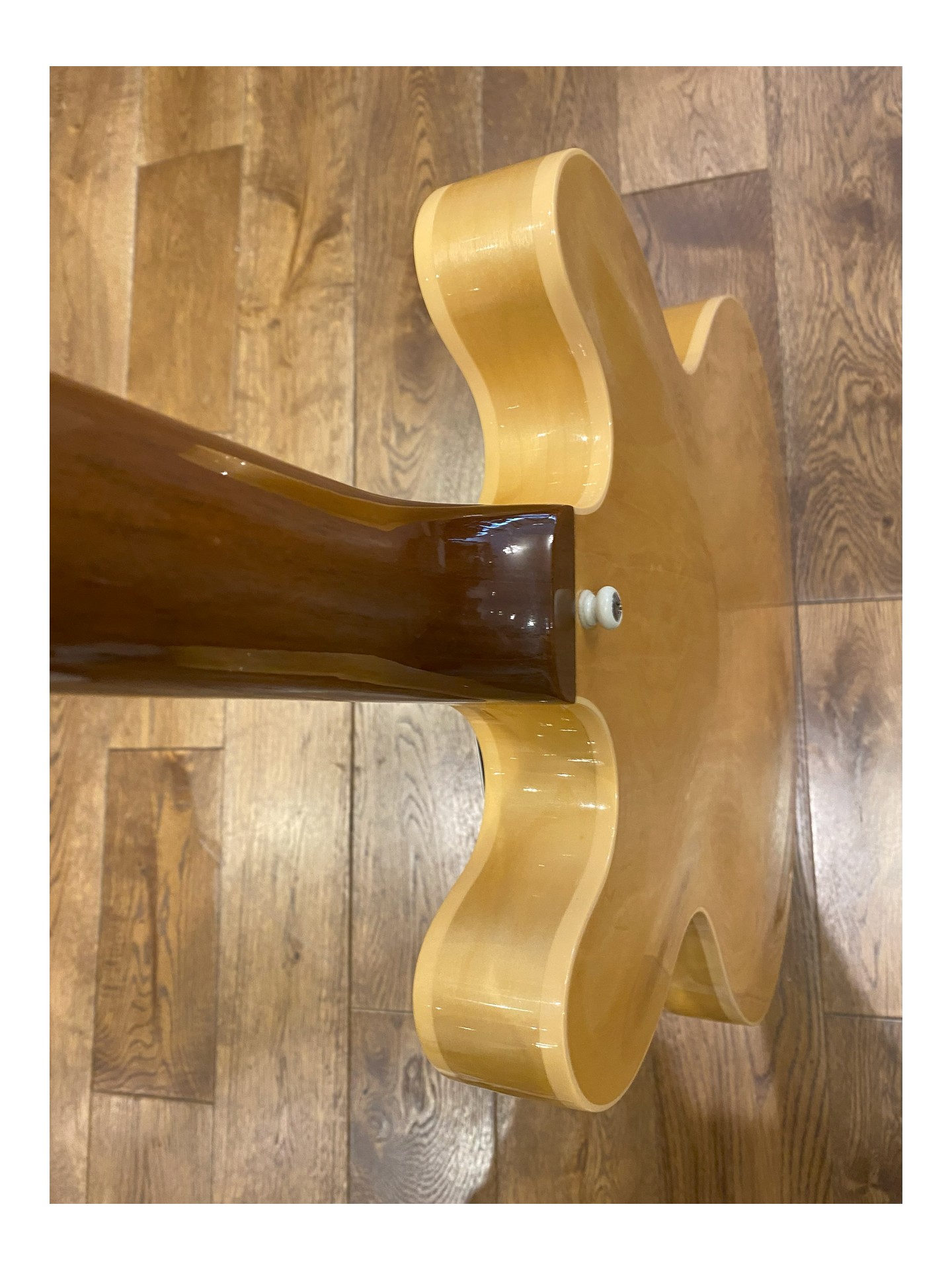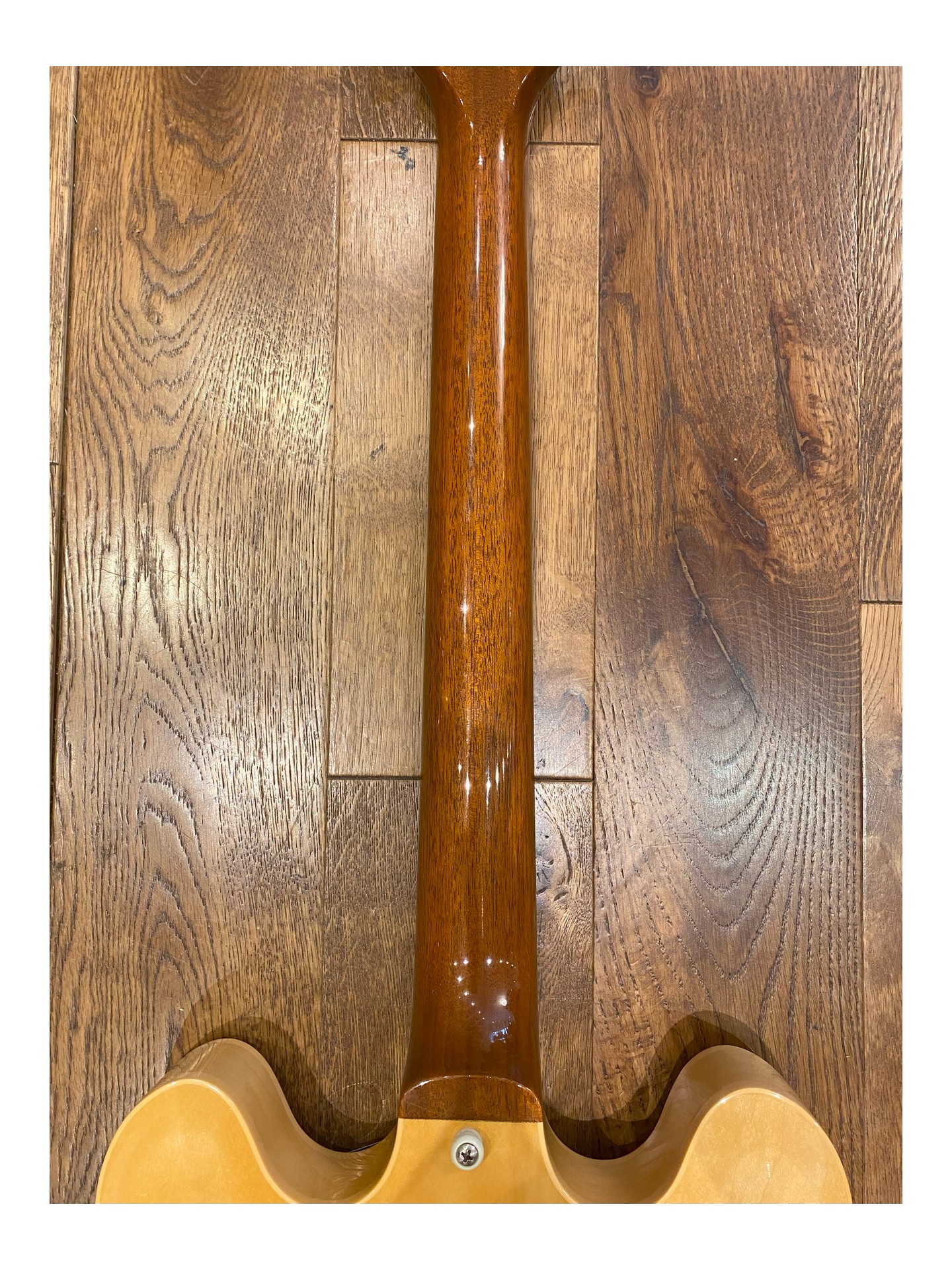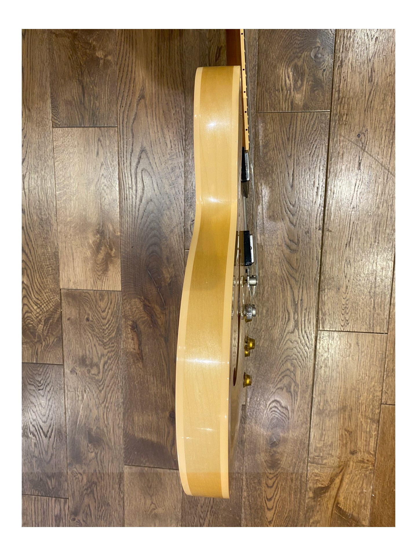La reine de toutes les ES-335 : la 59 blonde ! Une superbe guitare en excellente condition , avec un « long guard » , un manche profile 59 avec dots et une belle finition naturelle. Un instrument au son exceptionnel, à l’aspect et au toucher authentiques. Les micros ont été changés pour de plus haut de gamme Custom Buckers, les mécaniques ont été changées pour des Kluson « single Line » pour correspondre aux spécificités originales de 1959. Les mécaniques originales « double Line » sont fournies dans l’étui d’origine ainsi que le certificat du Custom Shop et tous les papiers d’origine.