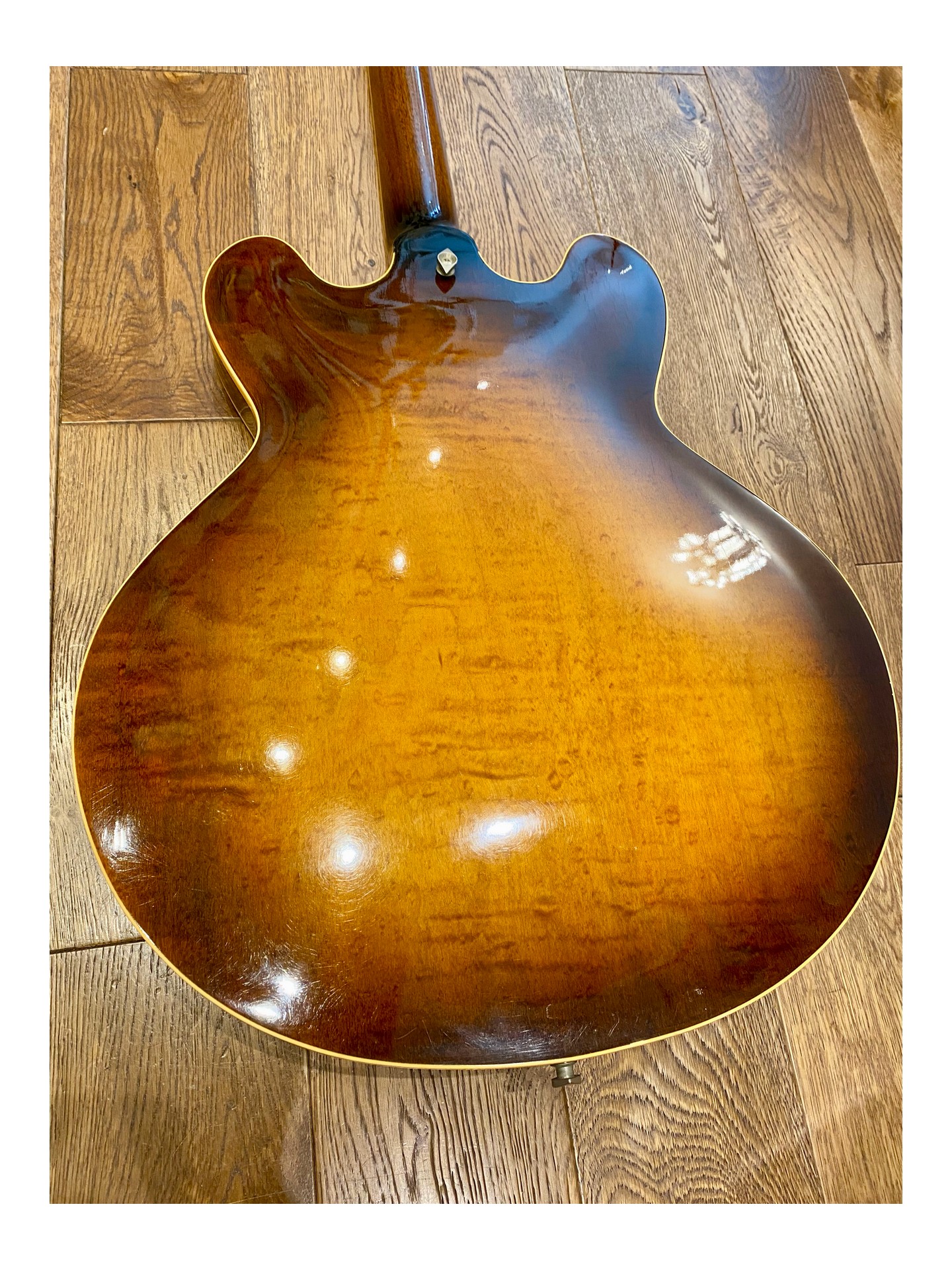 Gibson ES-335 DOT-Reissue from 1984 in excellent condition. The Custom Shop’s first “ES-335 Dot re-issue” with a flamed maple top in Sunburst finish, with its desirable “Tim Shaw PAF” pickups. Comfortable one-piece mahogany neck with a wide, but not thick, profile. The electronics have been replaced (pots + capacitors), as have the saddle and bridge. Original parts are supplied in the case. The guitar has also been refretted for perfect playability. The two PAF stickers are still on the surrounds of the original “Tim Shaw” Humbuckers pickups! The original brown leather case with pink lining is included.