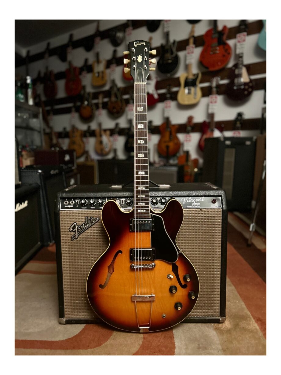 Gibson ES-335 TD de 1967 en excellente condition. Voici un exemple classique de la qualité de fabrication de Gibson des années 60. Avec son corps semi-hollow en érable et son bloc central massif, elle offre un sustain riche et une excellente résistance aux larsens. Le manche en acajou présente un profil confortable typique de l’époque, associé à une touche en palissandre brésilien et à des incrustations en bloc. Équipée de micros humbuckers Patent Number d’origine, cette ES-335 offre un son chaud et articulé avec beaucoup de punch, idéal pour le blues, le jazz et le rock. Entièrement originale, le chevalet ABR-1 d’origine s’étant comme souvent légèrement affaissé, est fourni dans l’étui mais a été remplacé par une reproduction Gotoh. Un Bigsby a été monté à un moment puis enlevé, laissant quelques légères traces sur le vernis de la table sous le cordier. Livrée en étui d’origine.
