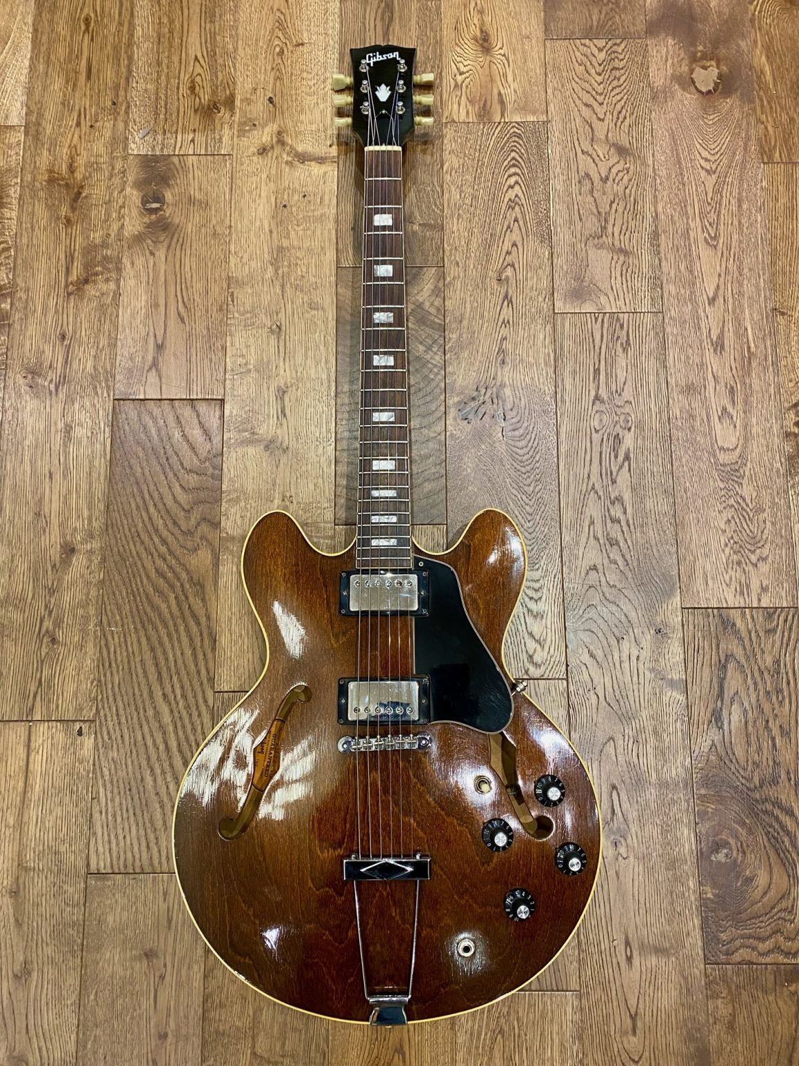 La guitare est en très bon état, le câblage « excentrique » d’origine à été modifié afin de retrouver les specs de la ES-335 (vol/tone – vol/tone).