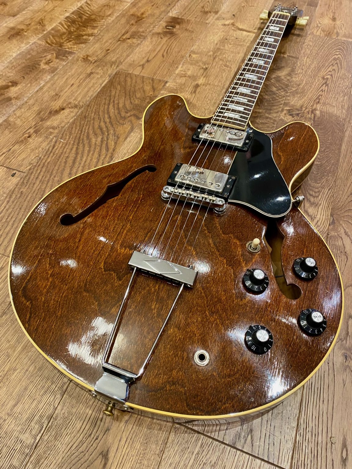La guitare est en très bon état, le câblage « excentrique » d’origine à été modifié afin de retrouver les specs de la ES-335 (vol/tone – vol/tone).