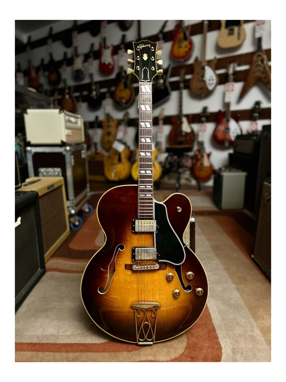 Une magnifique Gibson ES-350T de 1957 en finition Sunburst. Première année pour la ES-350T avec micros humbucker PAF ! Cette guitare est en excellent état pour son âge et entièrement d’origine à l’exception des deux potentiomètres de volume (les originaux, datés de la première semaine de 1957, sont fournis dans l’étui) et du chevalet ABR-1 (une modification classique compte tenu de la fragilité des originaux avec leur tendance à s’affaisser sur leur partie centrale) Micros PAF originaux de la toute première année, pour un son velouté majestueux aux nuances délicates. Magnifique corps en érable flammé et deux micros humbucker PAF d’origine avec des autocollants « Patent Applied For » au dos. Elle ne présente que des traces d’usure mineures et une légère décoloration typique du placage doré, une couleur sunburst intense avec une splendide patine du vernis d’origine . Le meilleur exemplaire que nous ayons vu jusqu’à présent ! Livrée dans son étui d’origine marron avec une doublure en peluche rose.
